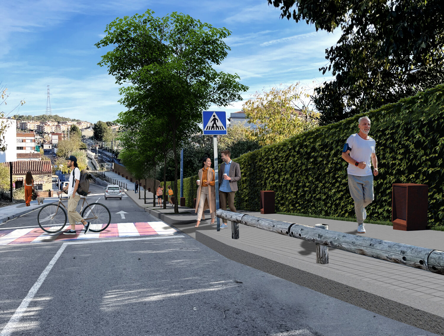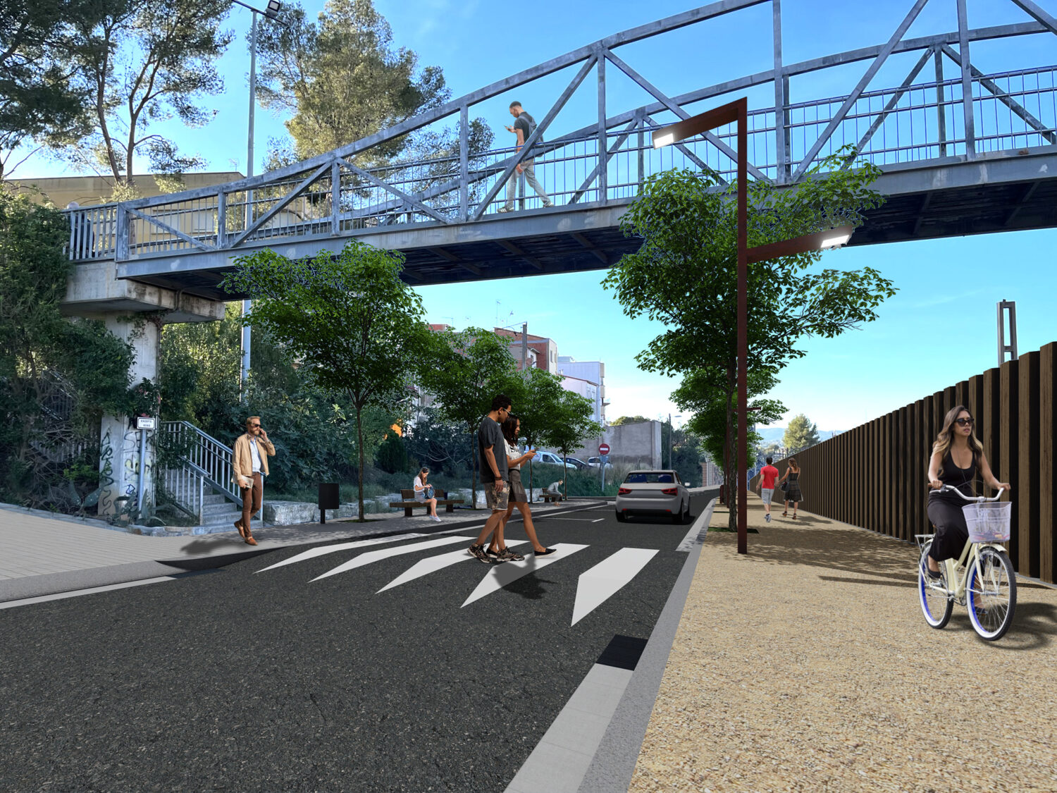 • Creation of a pedestrian route parallel to the train track, by means of a dirt road with a wooden fence that will act as a visual and acoustic barrier to the train.