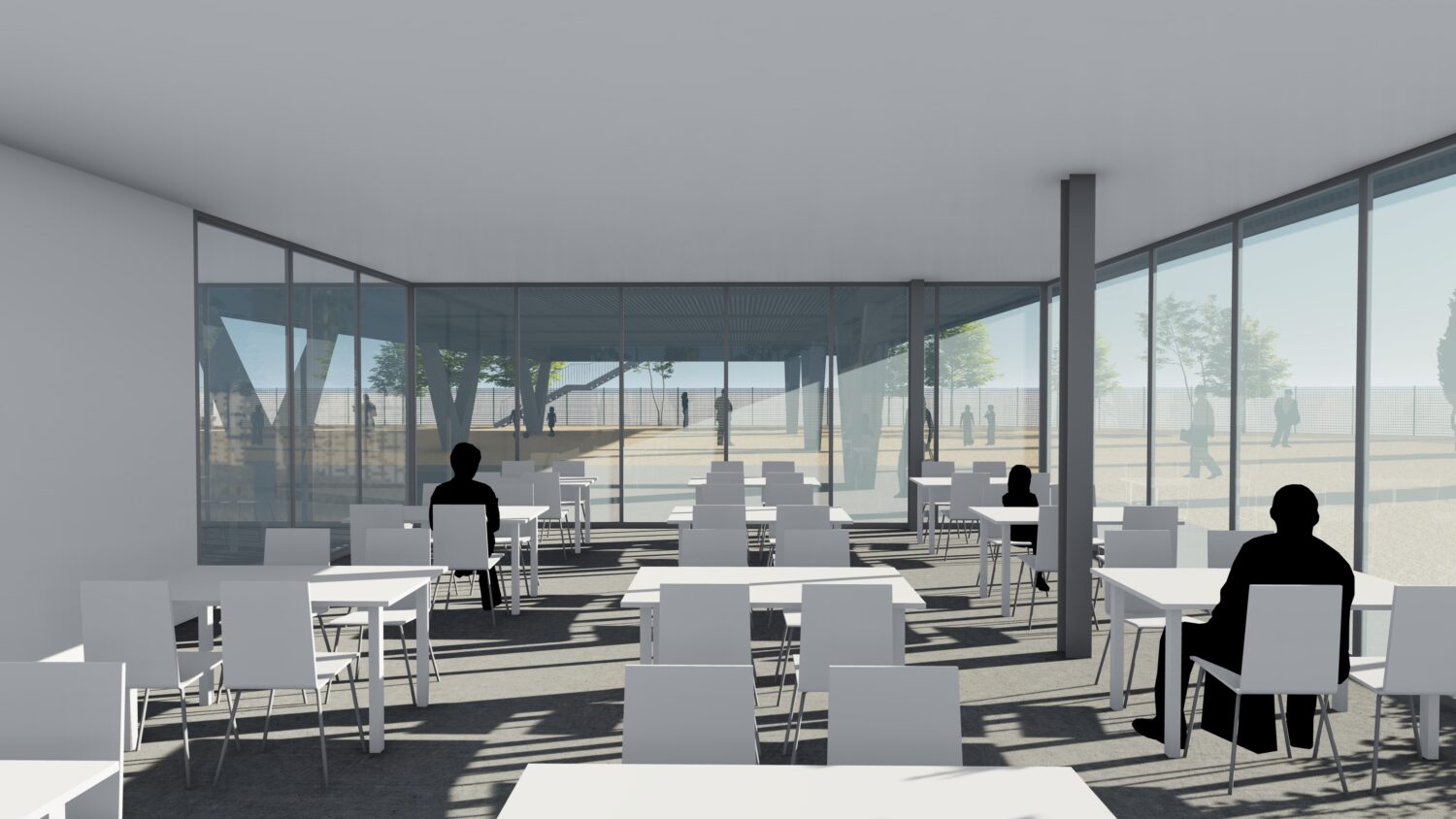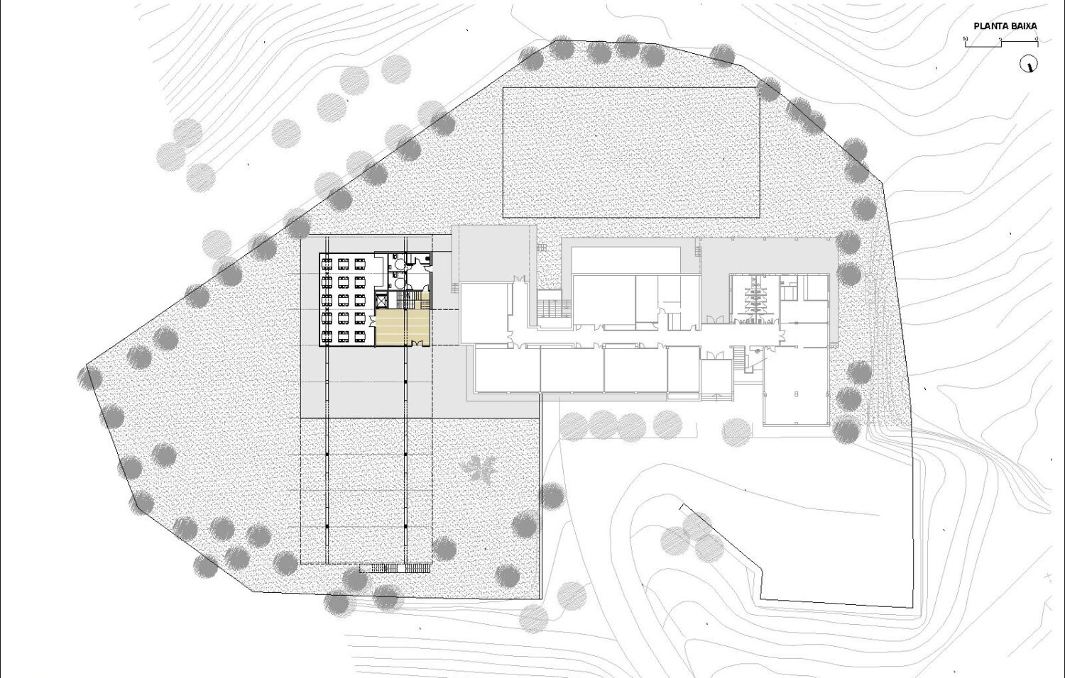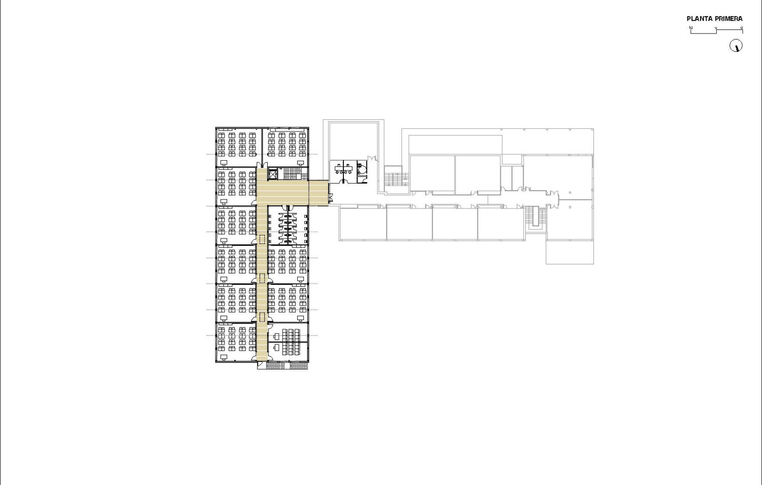The level of the ground floor is located at the level of the courtyards, so that the porch that is generated becomes another courtyard for the high school. In this porch, the pillars are unified as tripods in order to reduce their number and leave a more open space.