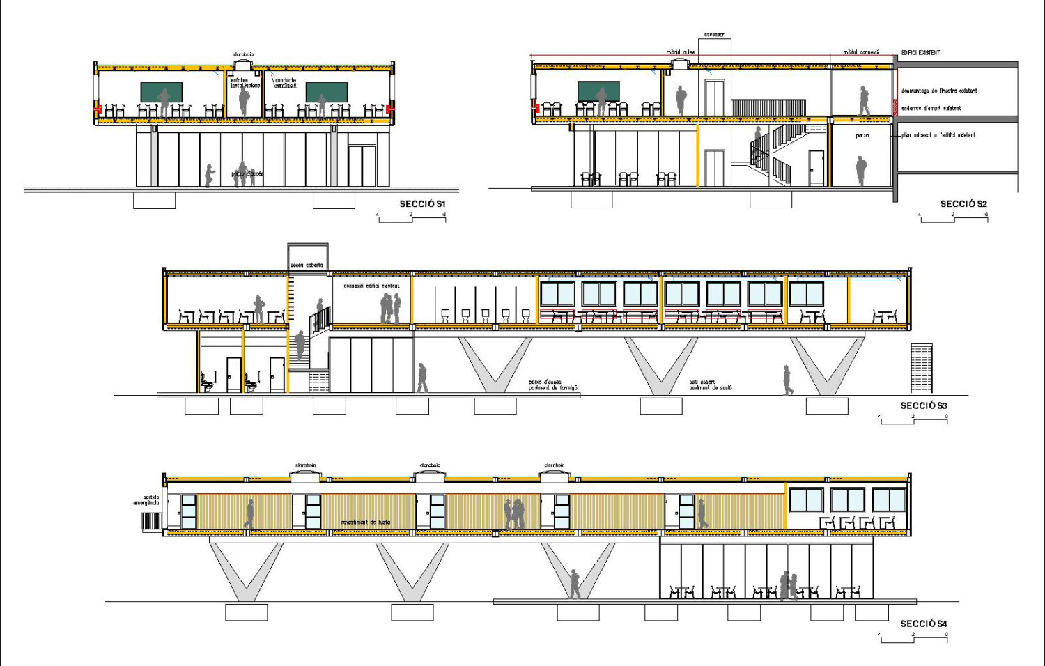 The connecting corridor between the existing building and the extension is solved by means of another prefabricated module of 5×3’65 m supported on the two buildings. In this way, resources are optimized and the diversity of construction systems is simplified.
