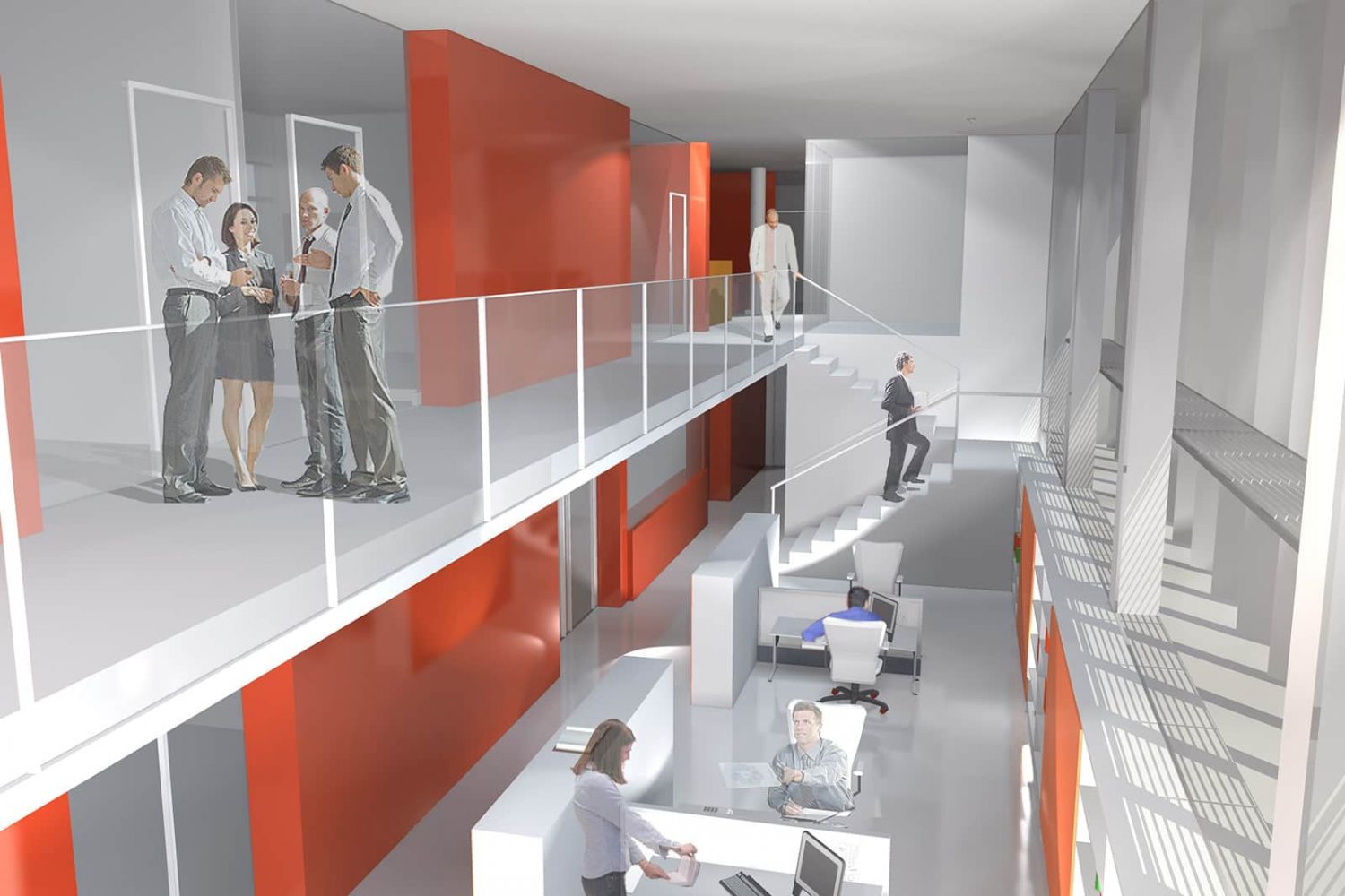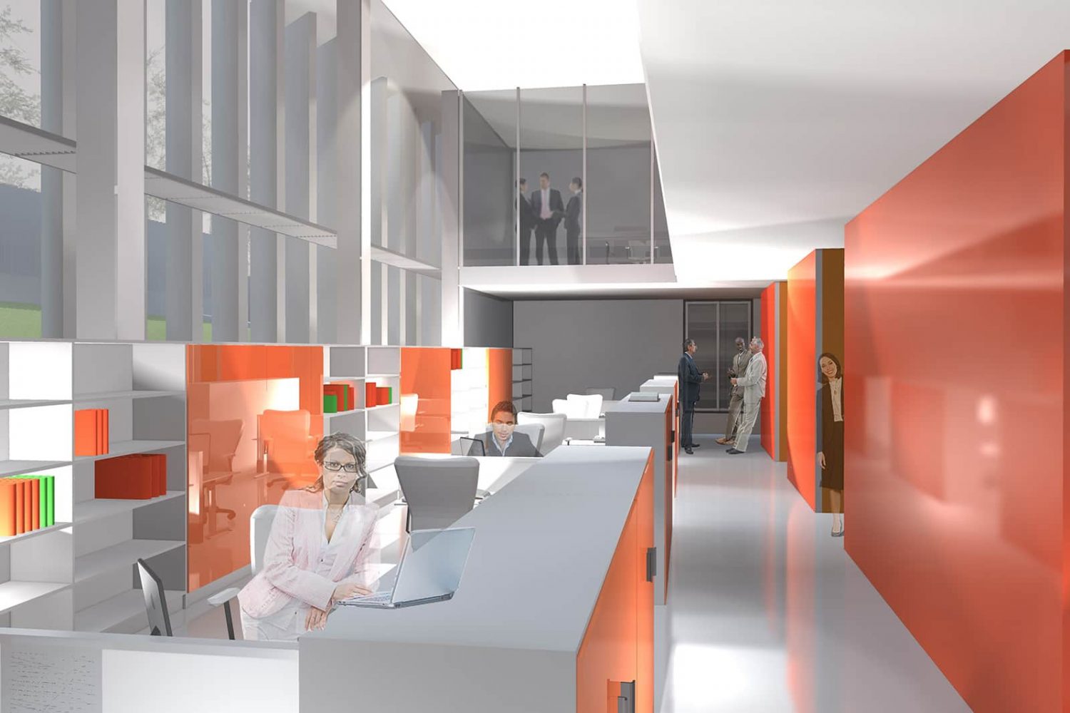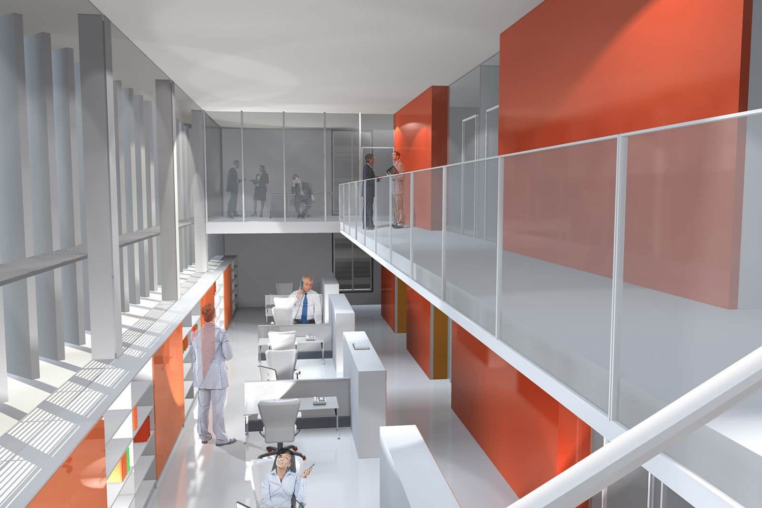 Office space is developed on the lower floor, with double height, while offices and meeting rooms are located on the superior access floor.