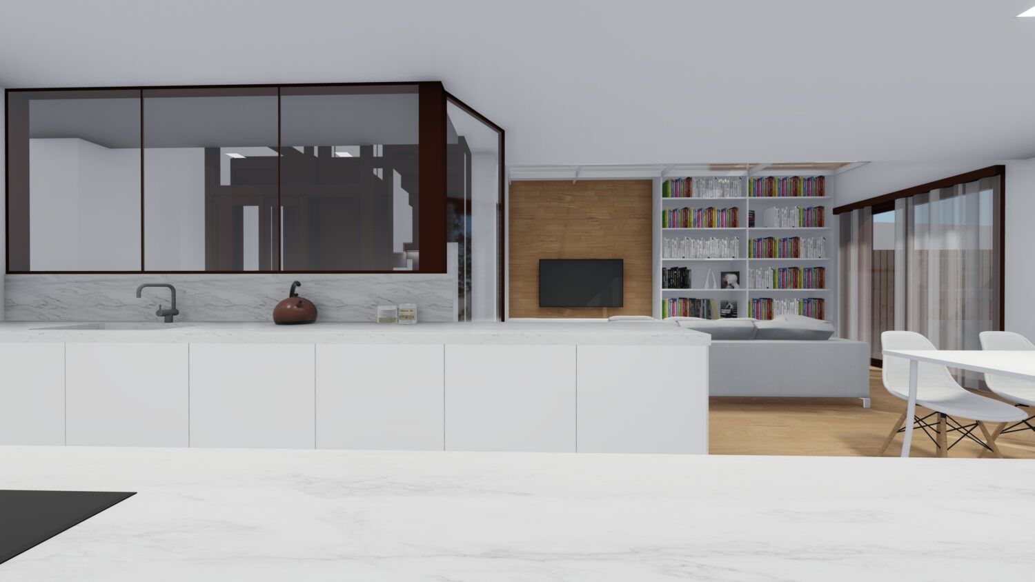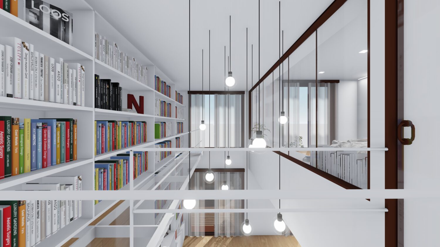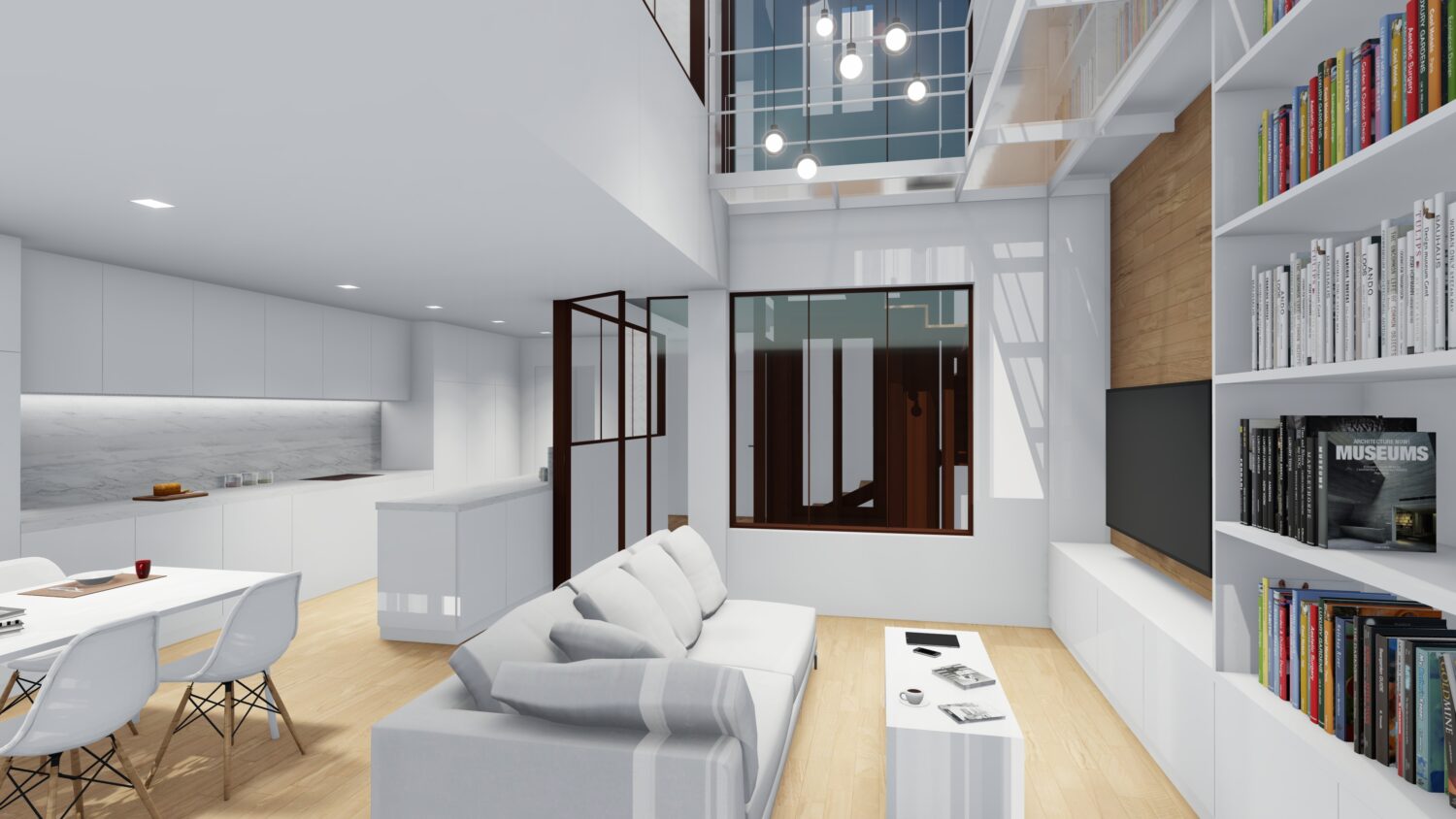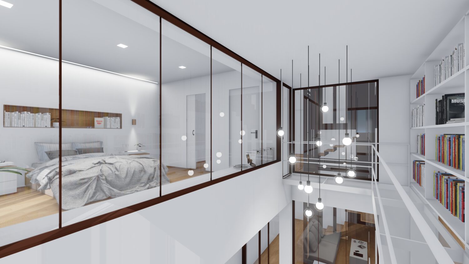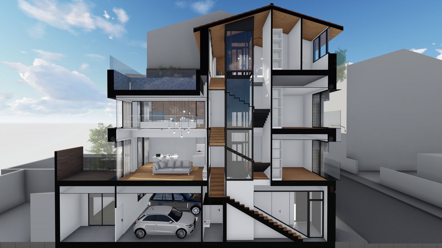 The house is located within a plot between party walls and it consists of ground floor and three upper floors. The central idea of the project is to generate a large double space in the dining room that visually communicates the space with the suite bedroom on the top floor and, at the same time, it contains the extensive library owned by the promoters. The ground floor will be dedicated to parking, the first floor to the day areas, the second floor to the bedrooms and the top floor, the attic, will be occupied by a studio with solarium and pool.