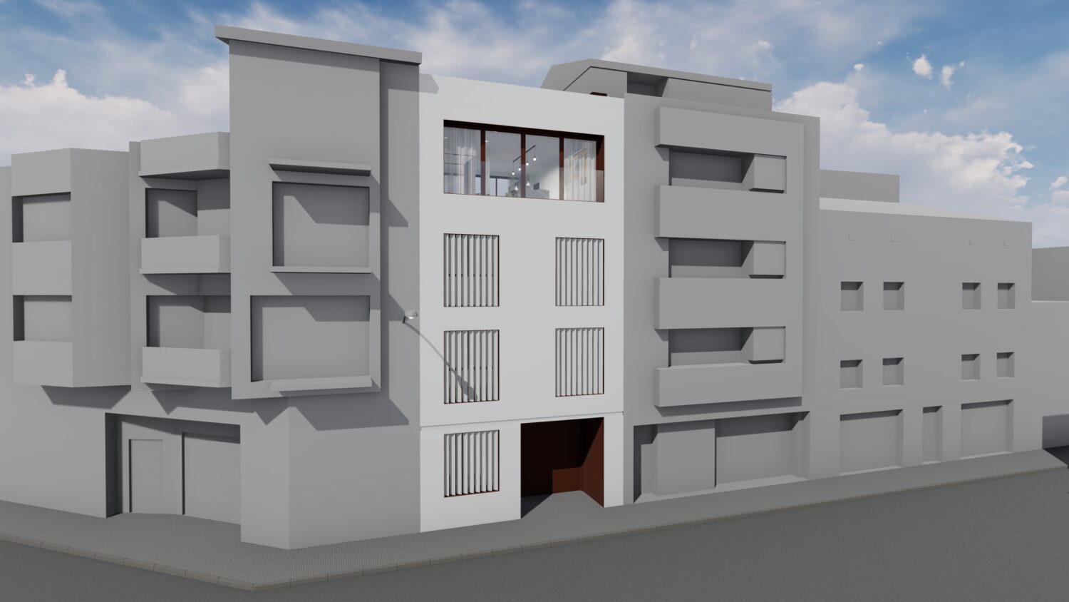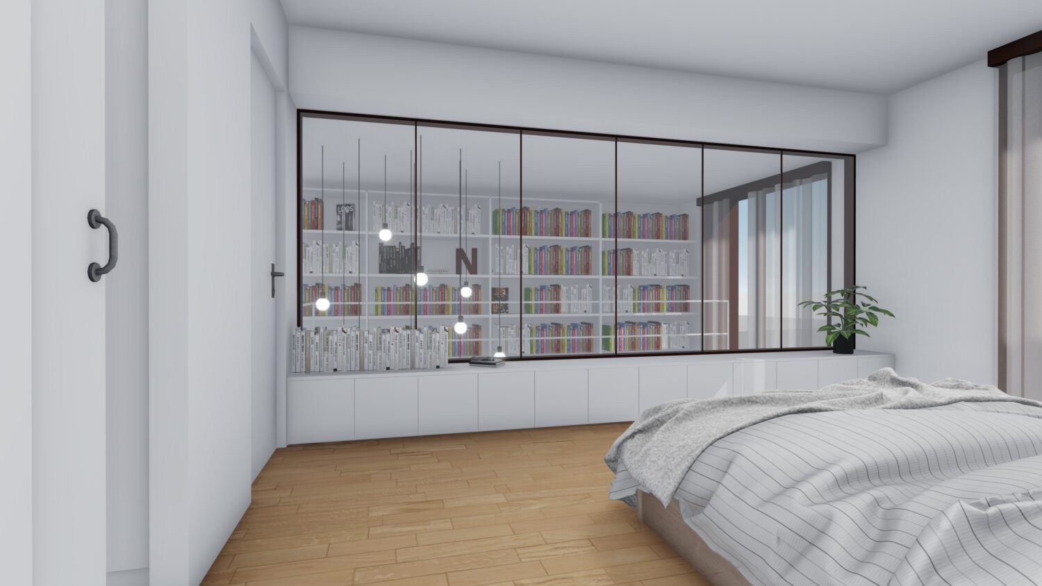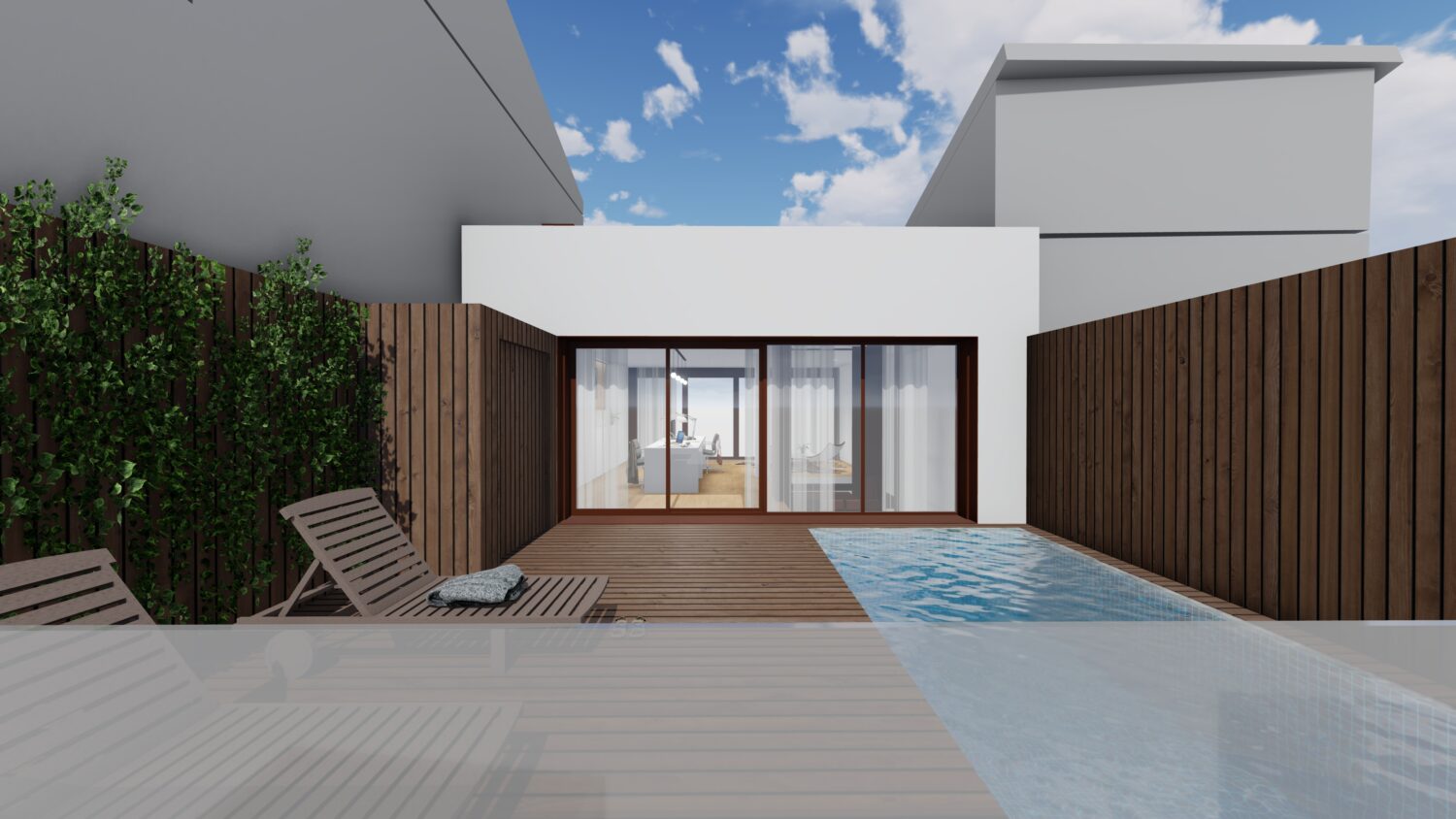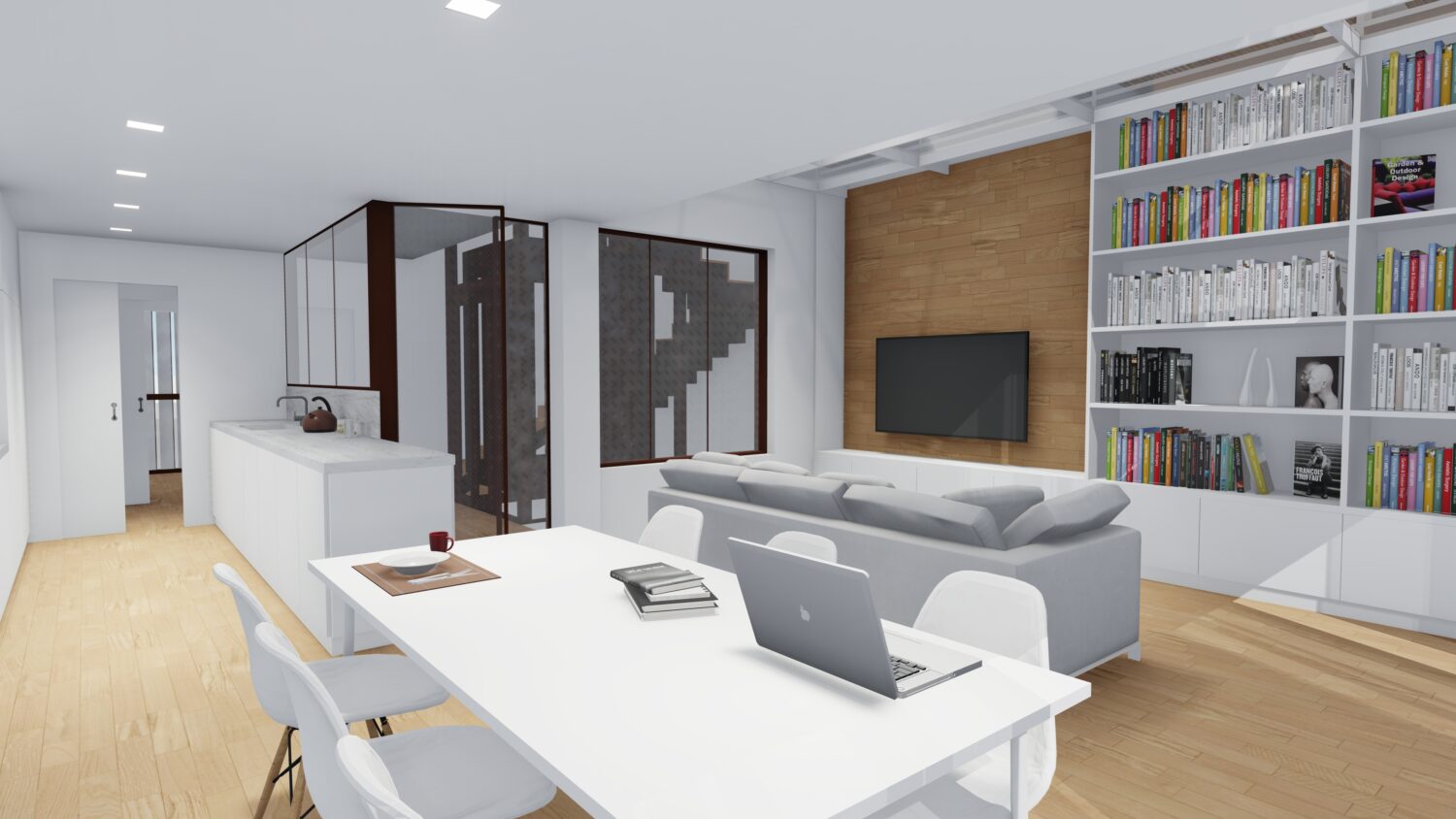 The house is located within a plot between party walls and it consists of ground floor and three upper floors. The central idea of the project is to generate a large double space in the dining room that visually communicates the space with the suite bedroom on the top floor and, at the same time, it contains the extensive library owned by the promoters. The ground floor will be dedicated to parking, the first floor to the day areas, the second floor to the bedrooms and the top floor, the attic, will be occupied by a studio with solarium and pool.