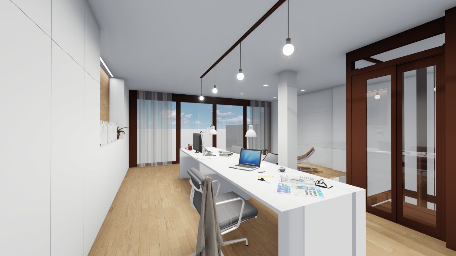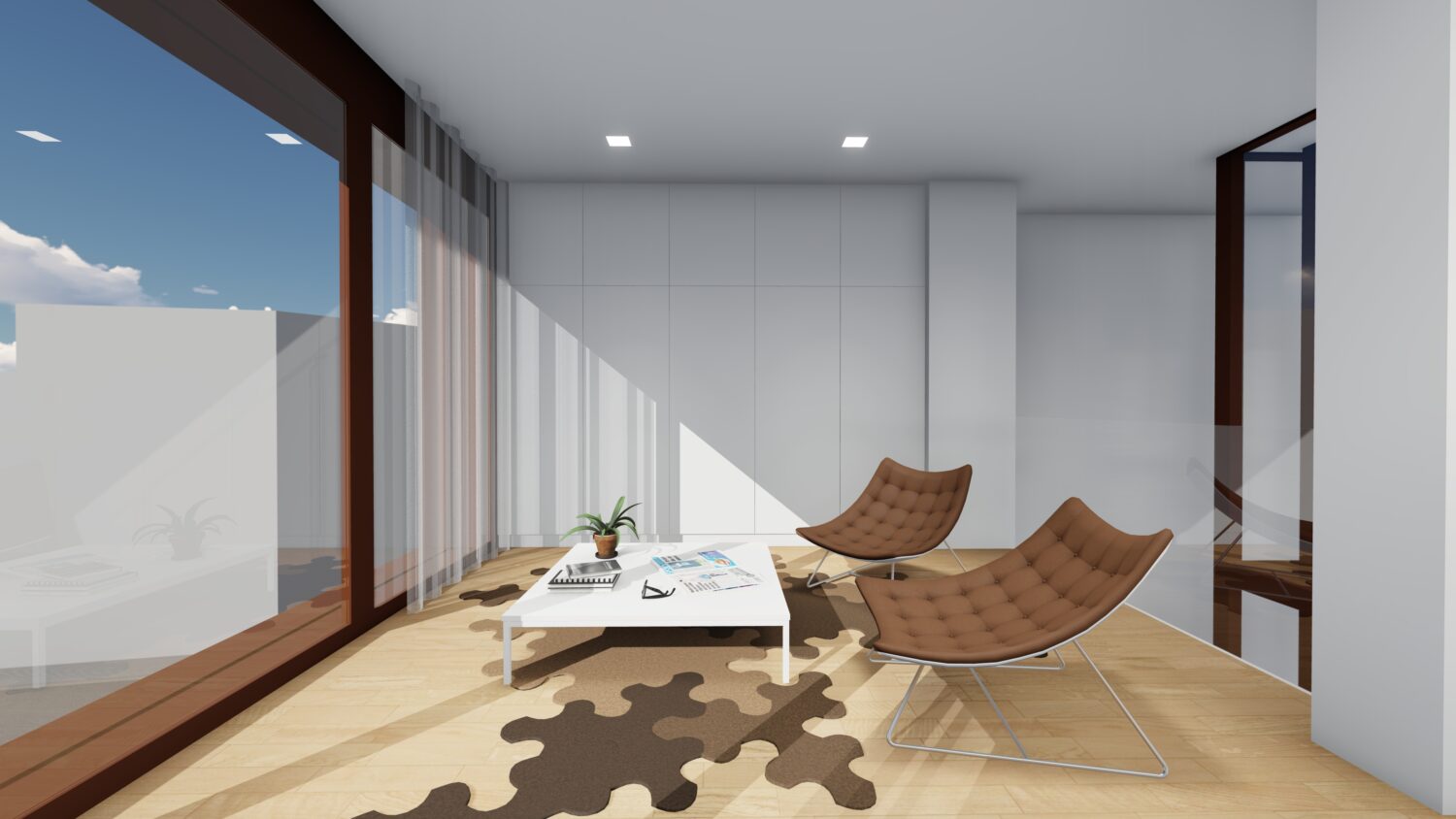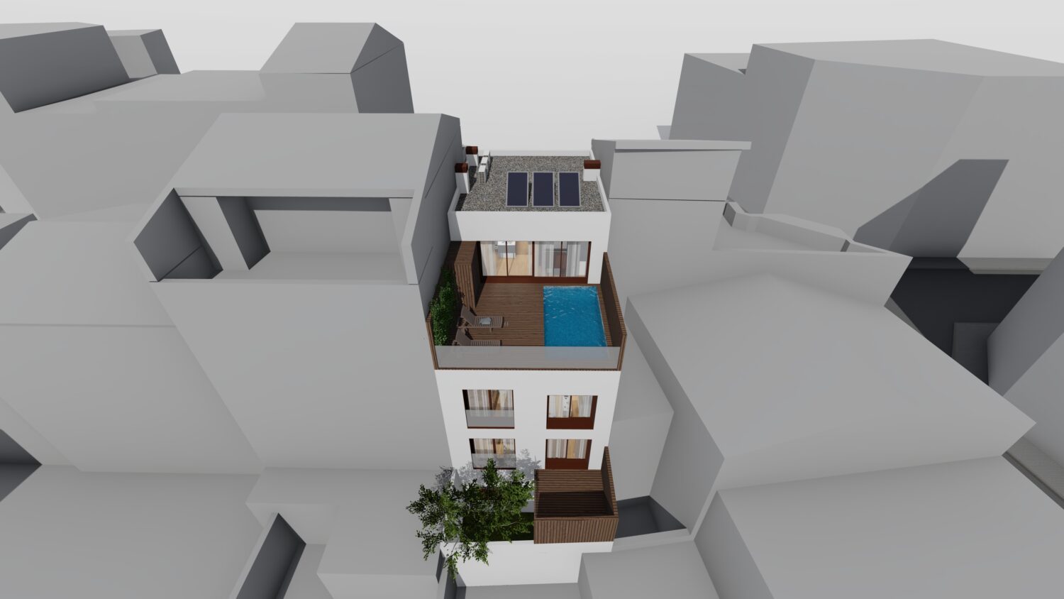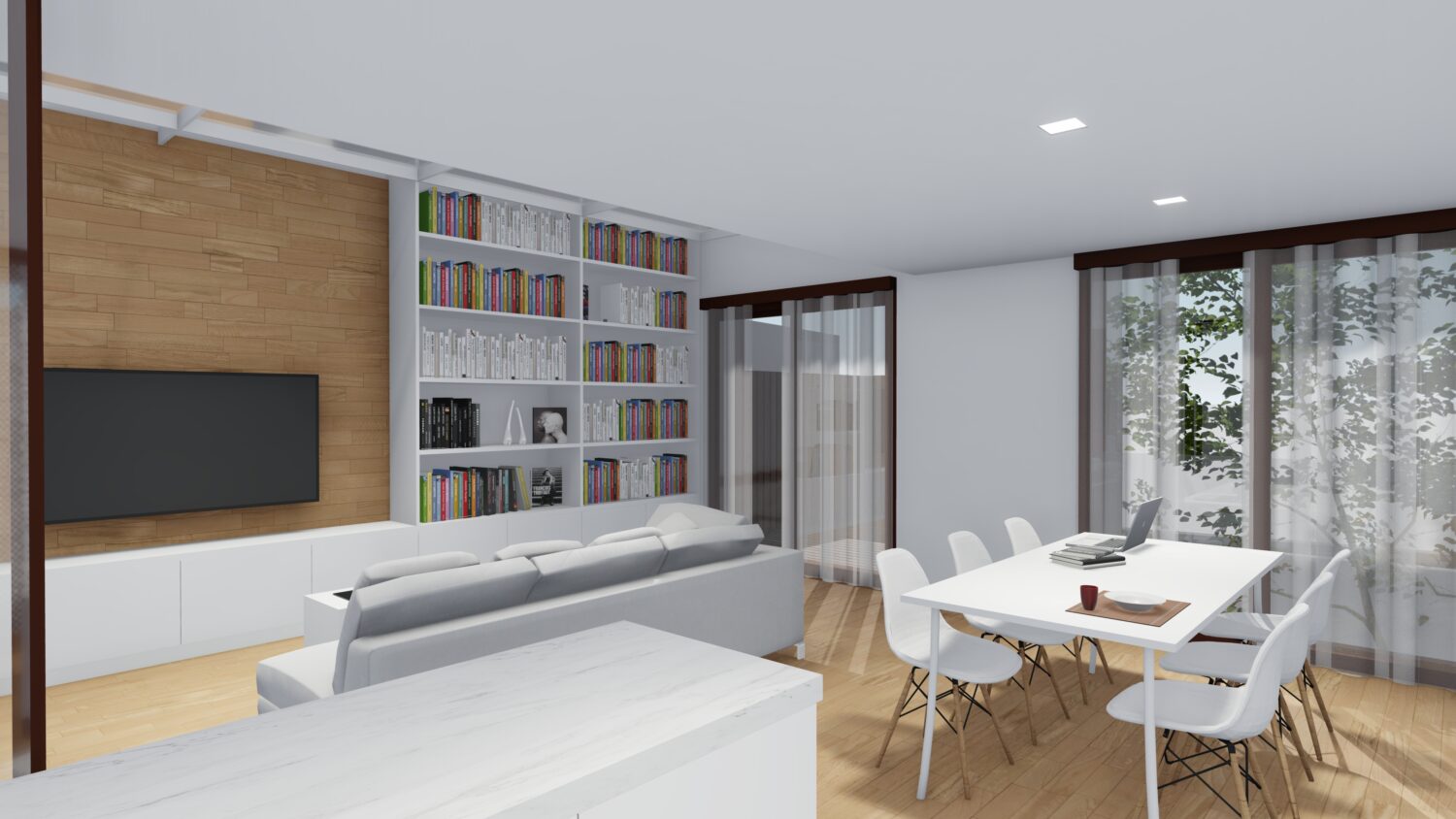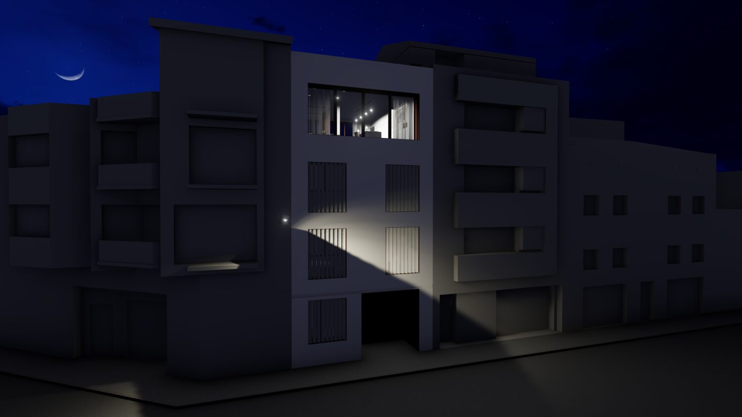 The house is located within a plot between party walls and it consists of ground floor and three upper floors. The central idea of the project is to generate a large double space in the dining room that visually communicates the space with the suite bedroom on the top floor and, at the same time, it contains the extensive library owned by the promoters. The ground floor will be dedicated to parking, the first floor to the day areas, the second floor to the bedrooms and the top floor, the attic, will be occupied by a studio with solarium and pool.
