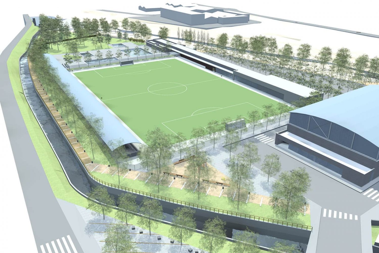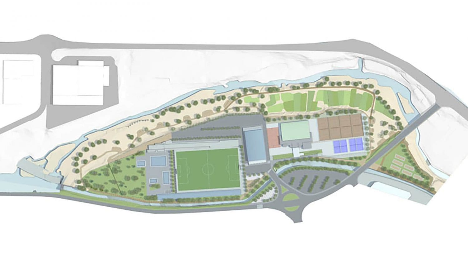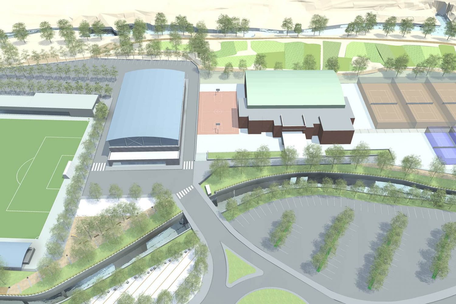 The area includes football field, sports hall, sports court, racket area and summer pools.
