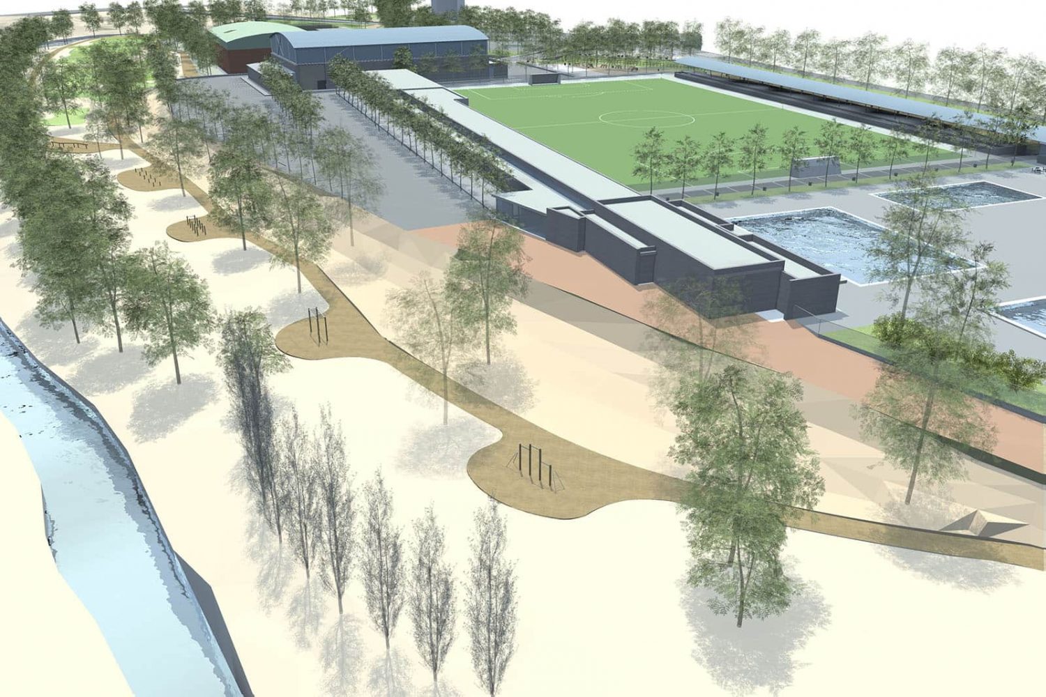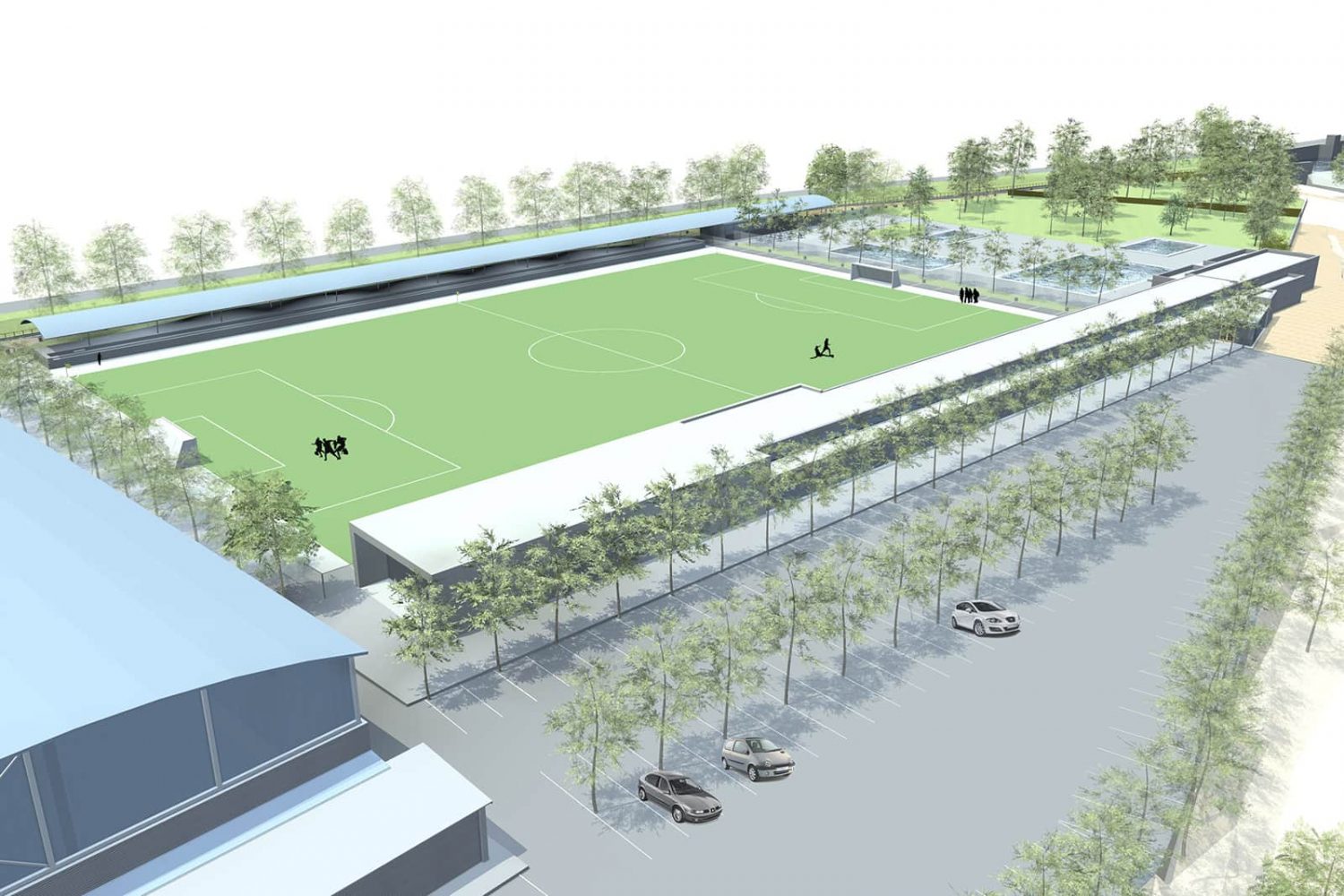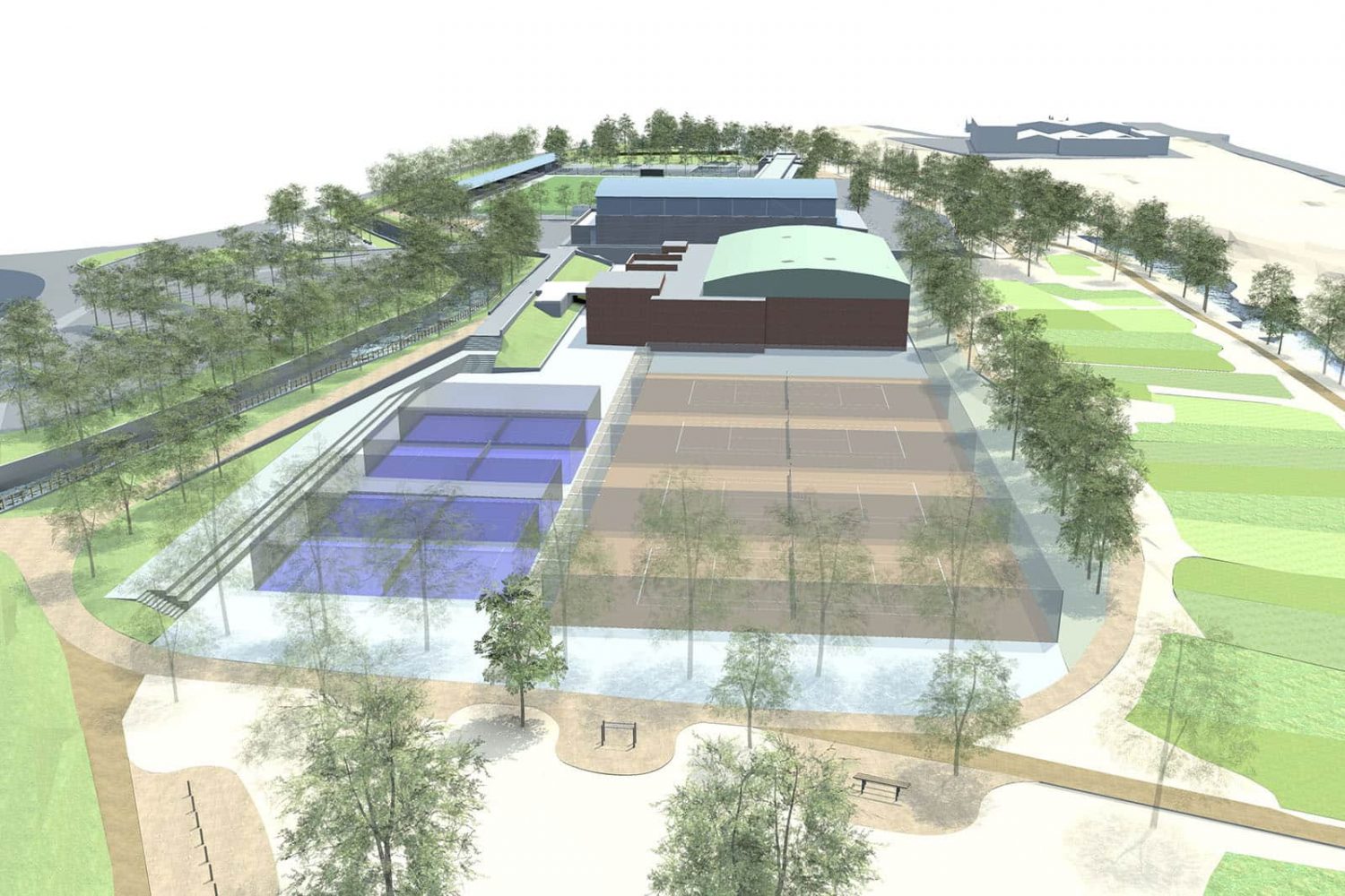 The area includes football field, sports hall, sports court, racket area and summer pools.