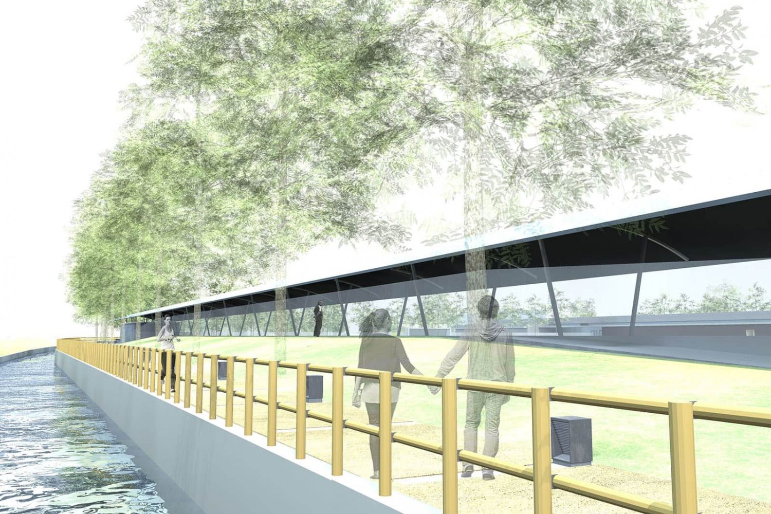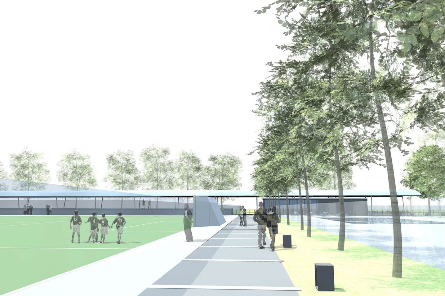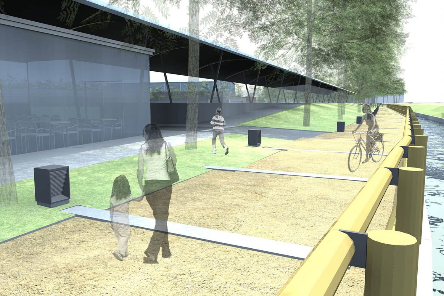 It proposes the urbanization of an perimeter walking area walk that links all the spaces and includes a children’s games area and areas for the practice of outdoor sport.