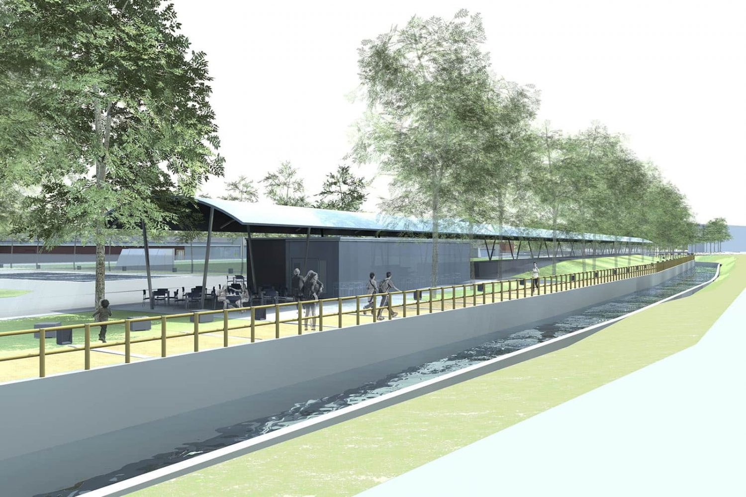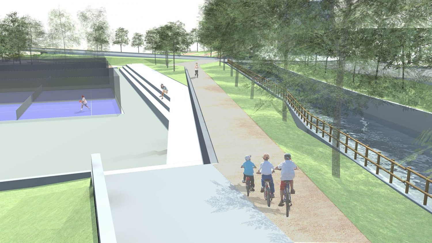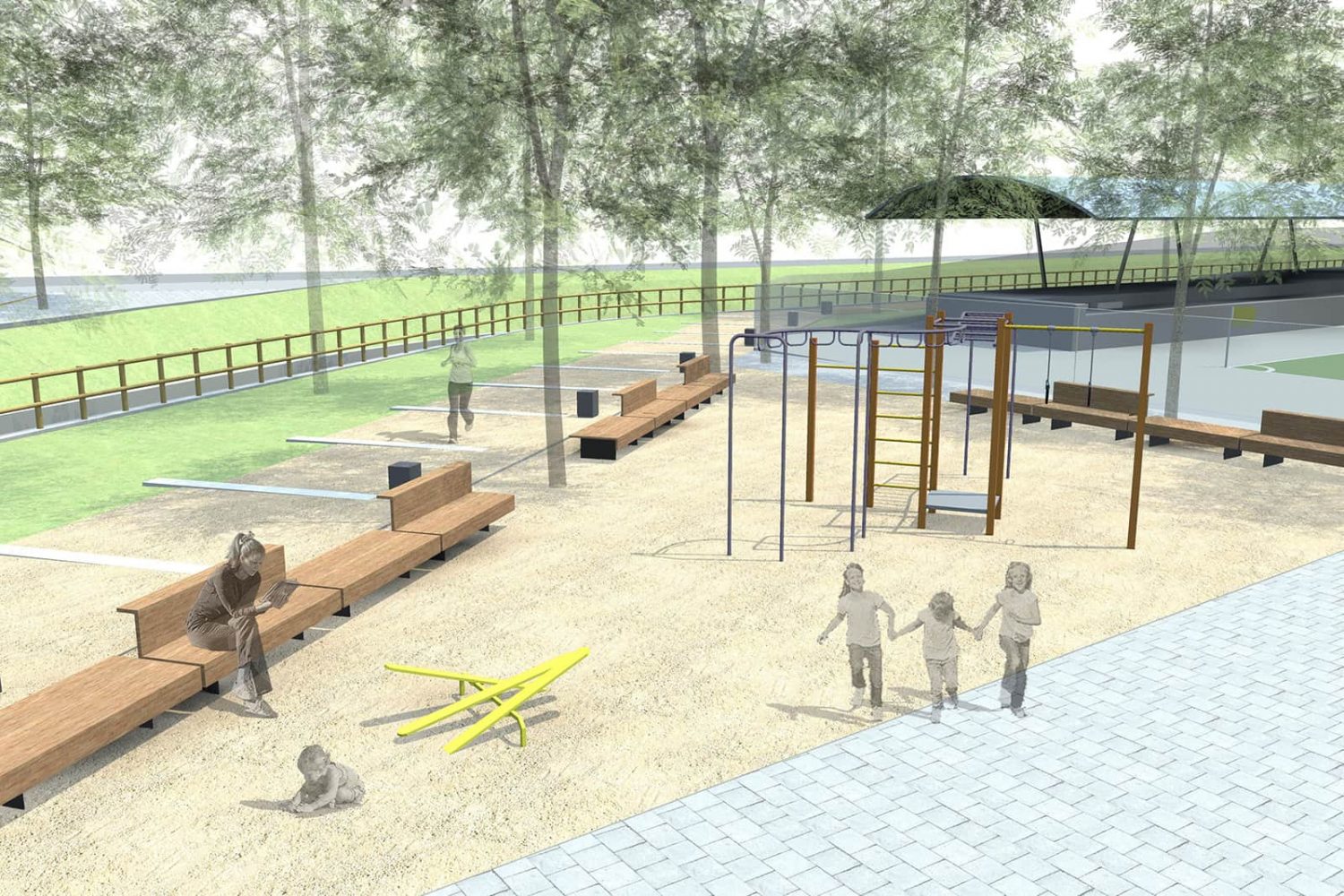 It proposes the urbanization of an perimeter walking area walk that links all the spaces and includes a children’s games area and areas for the practice of outdoor sport.