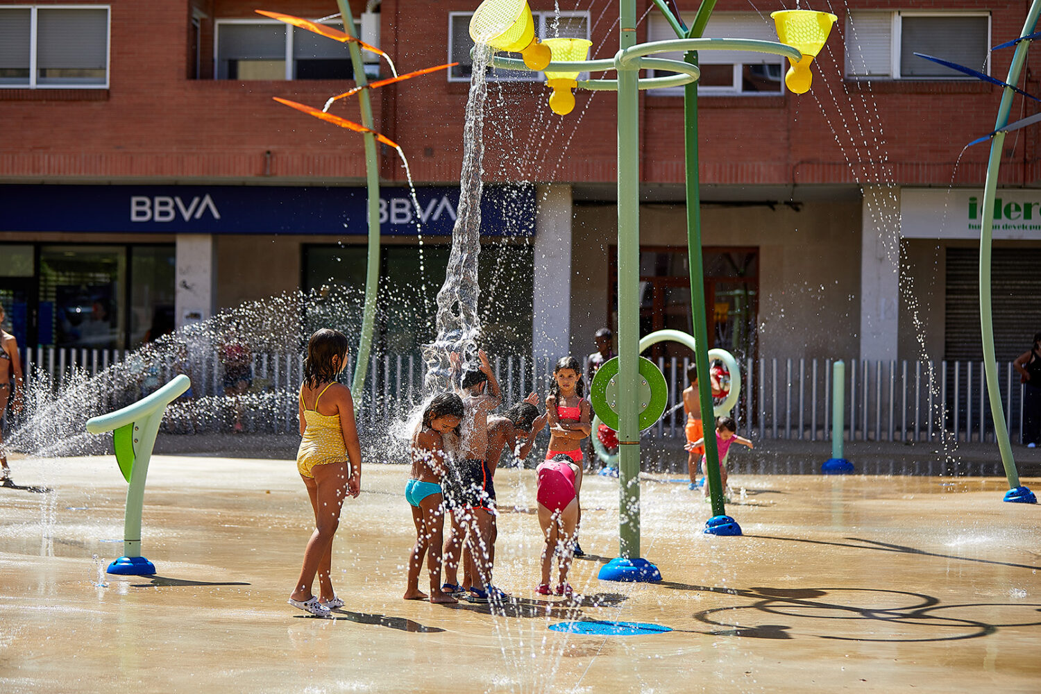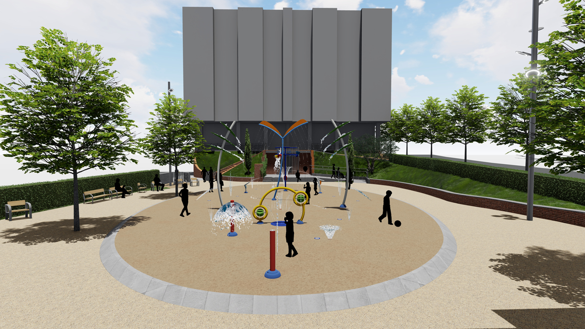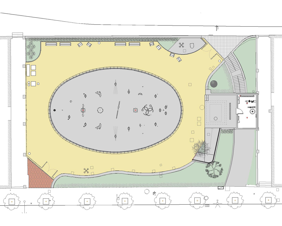 The water play area is delimited by a concrete floor and a bars fence, while the rest of the space will be treated with sand pavement.