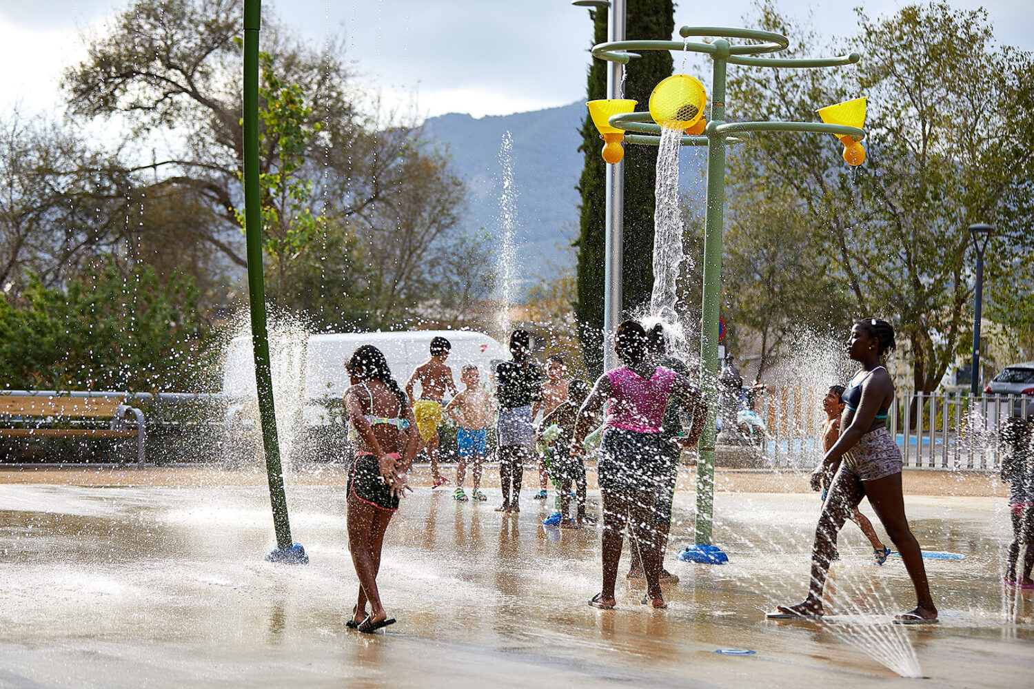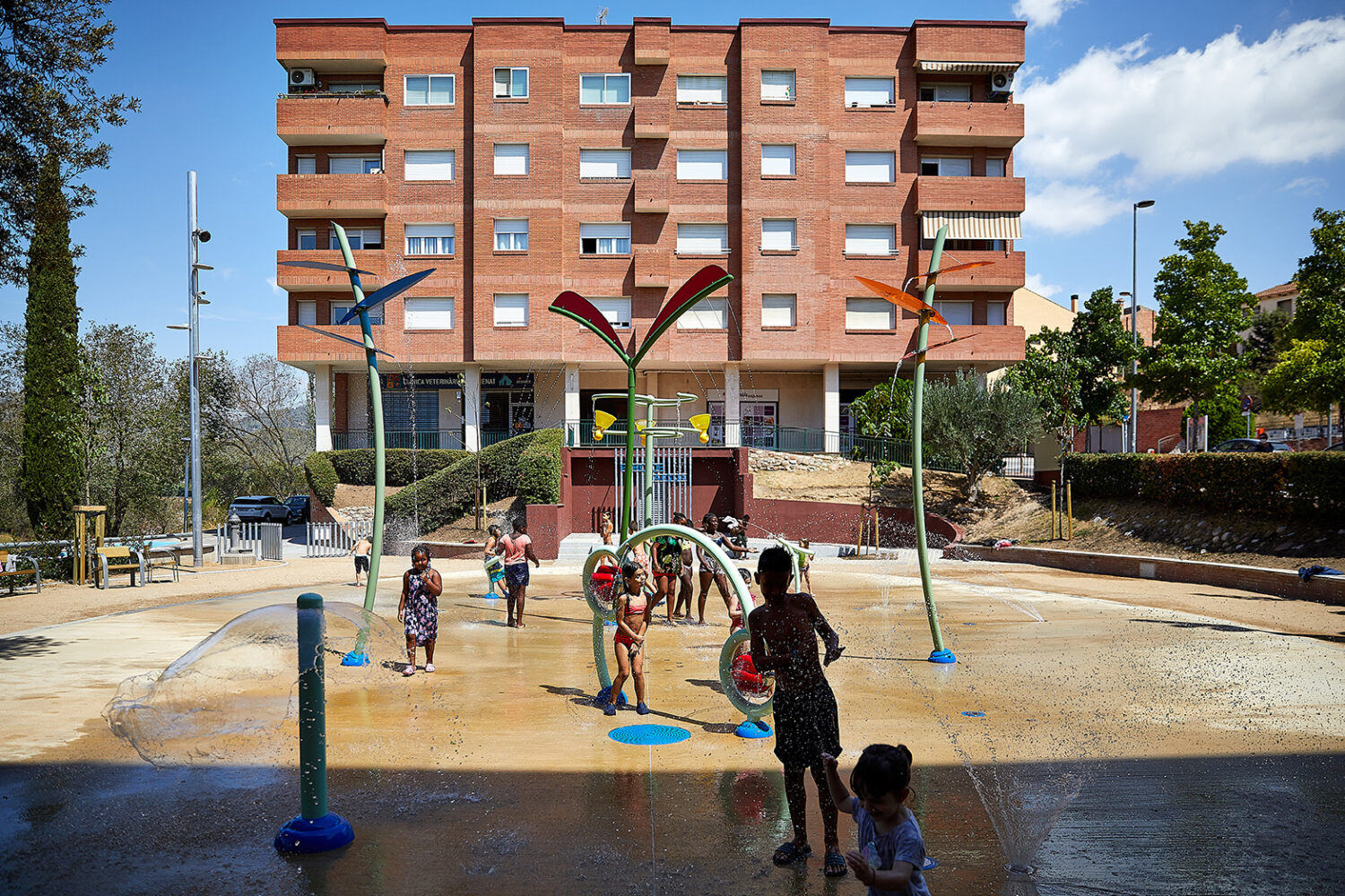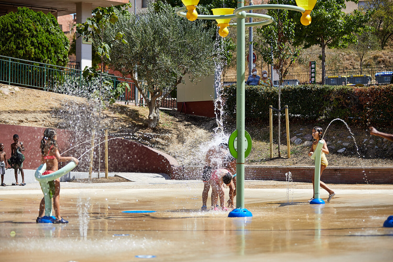 The water play area is delimited by a concrete floor and a bars fence, while the rest of the space will be treated with sand pavement.