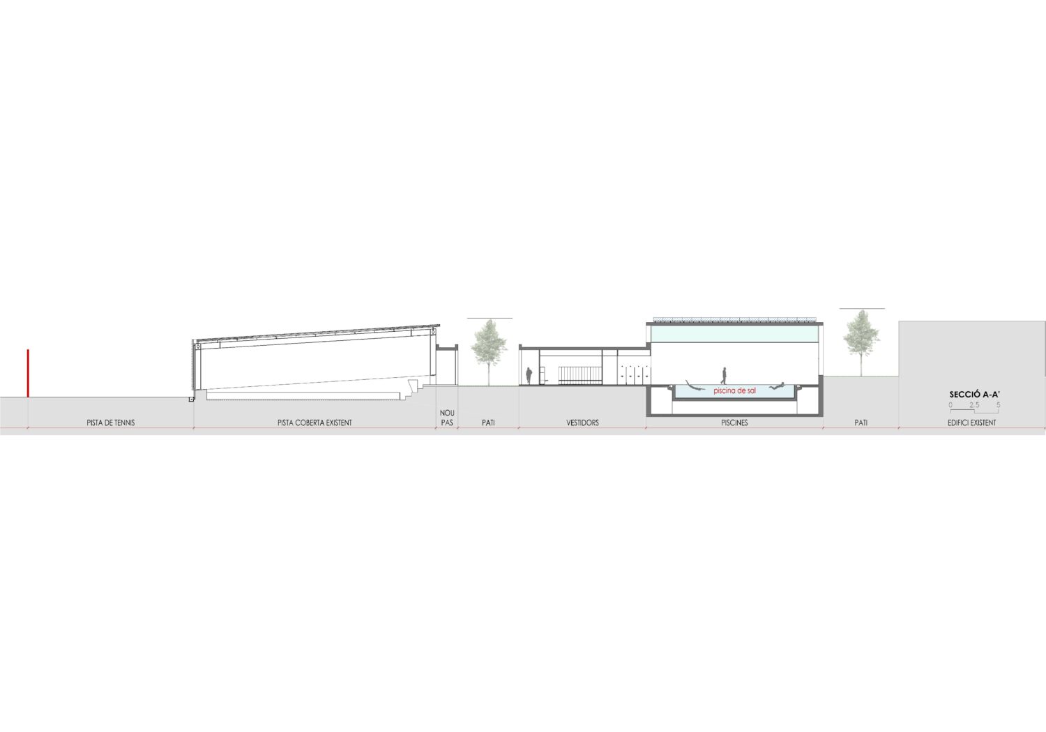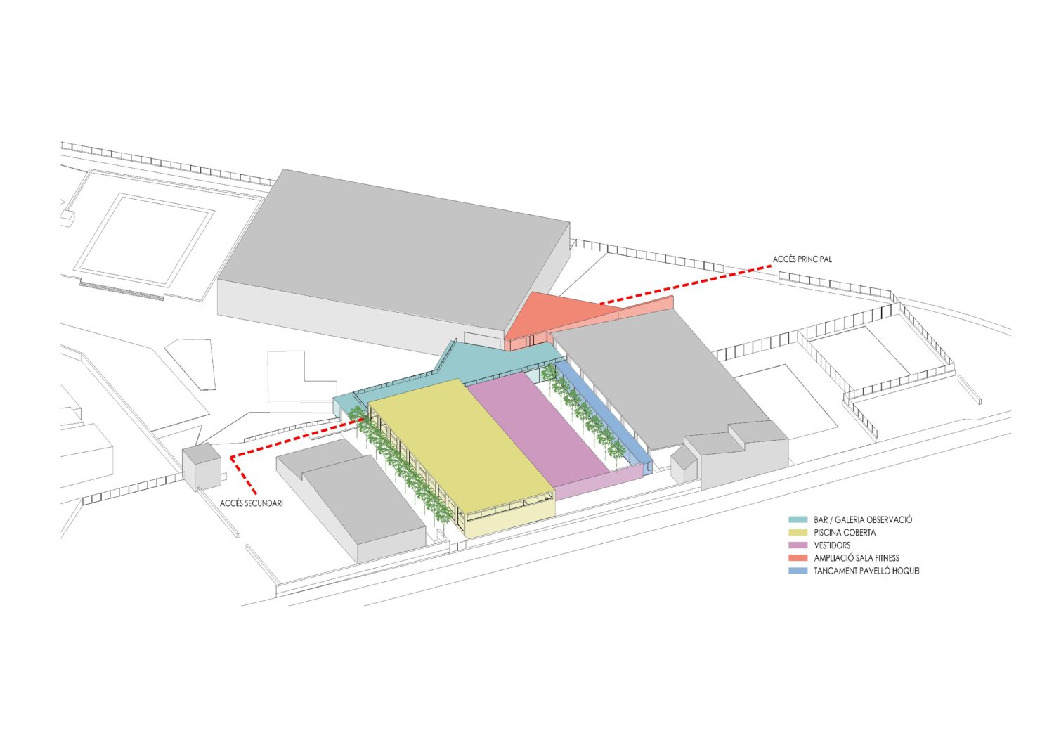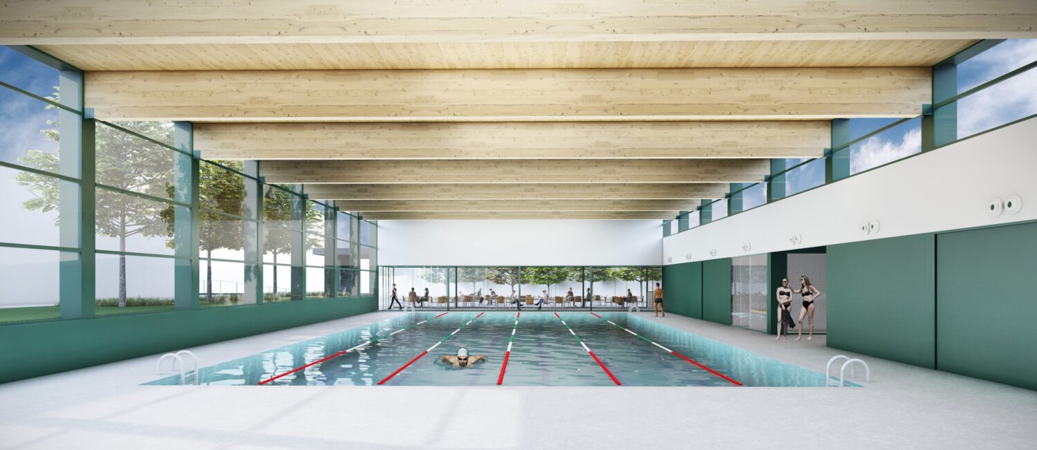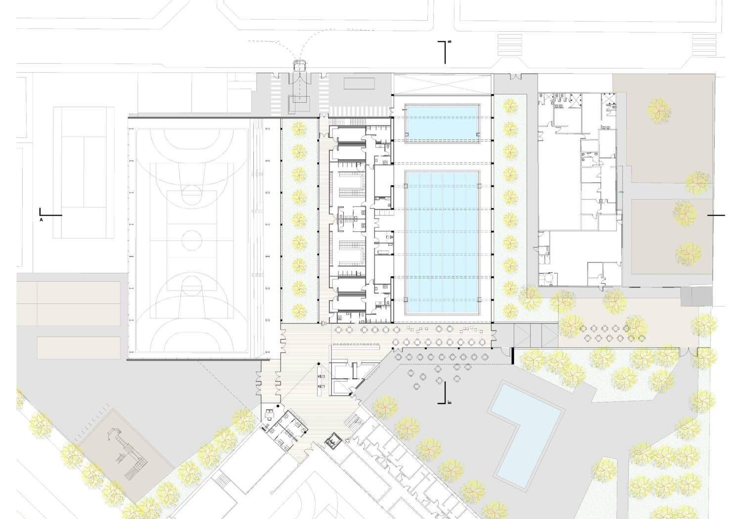 The building is composed of two rectangular volumes arranged in parallel: one containing the changing rooms and the other the indoor swimming pools. These are supported by a perpendicular bar that houses the building’s entrances and serves as a hinge between the new facility and the existing sports hall and hockey rink. On the first floor, the fitness room of the sports hall is expanded by means of a volume that opens towards the access area, offering views of the river while also shaping the porch of the main entrance to the building.