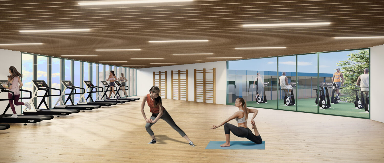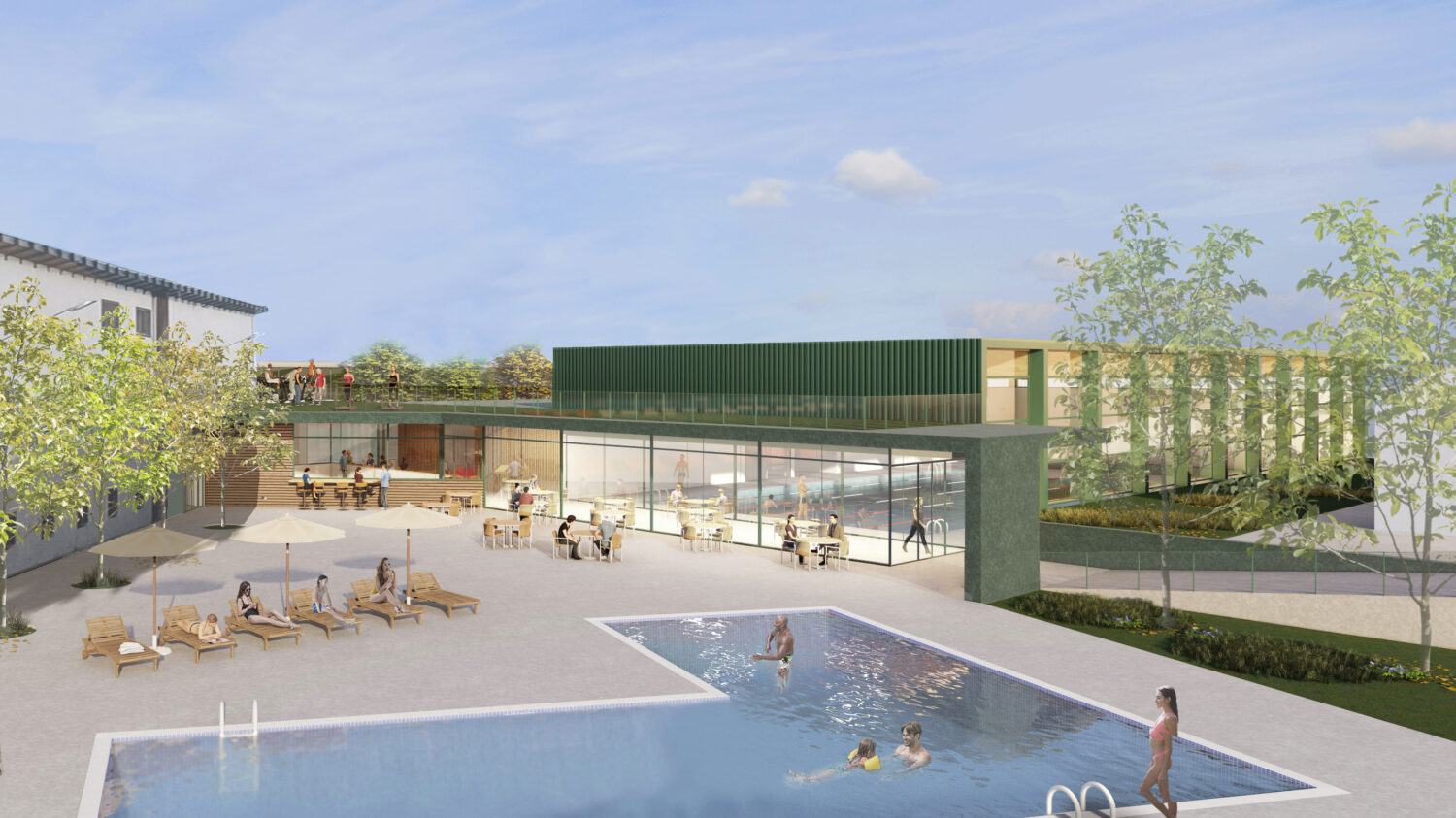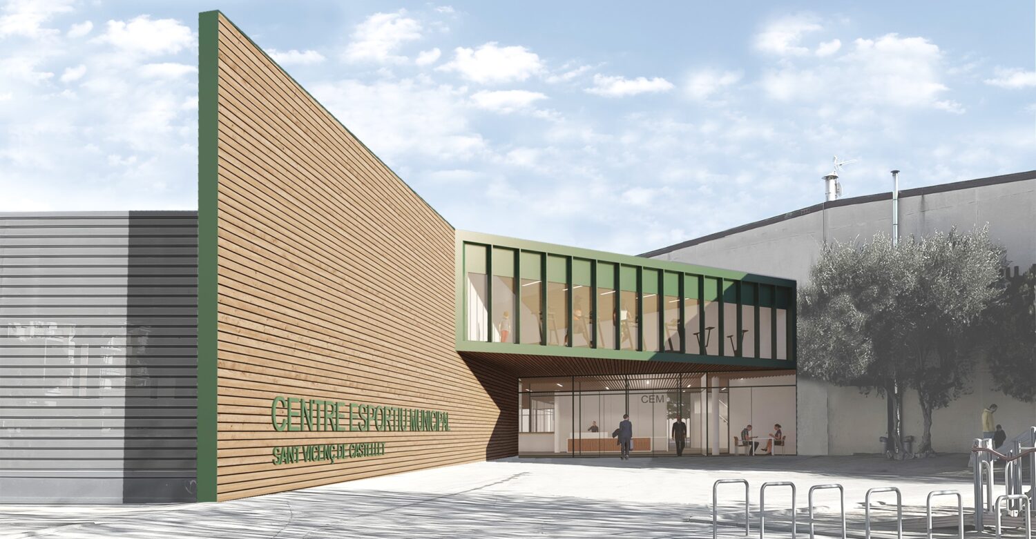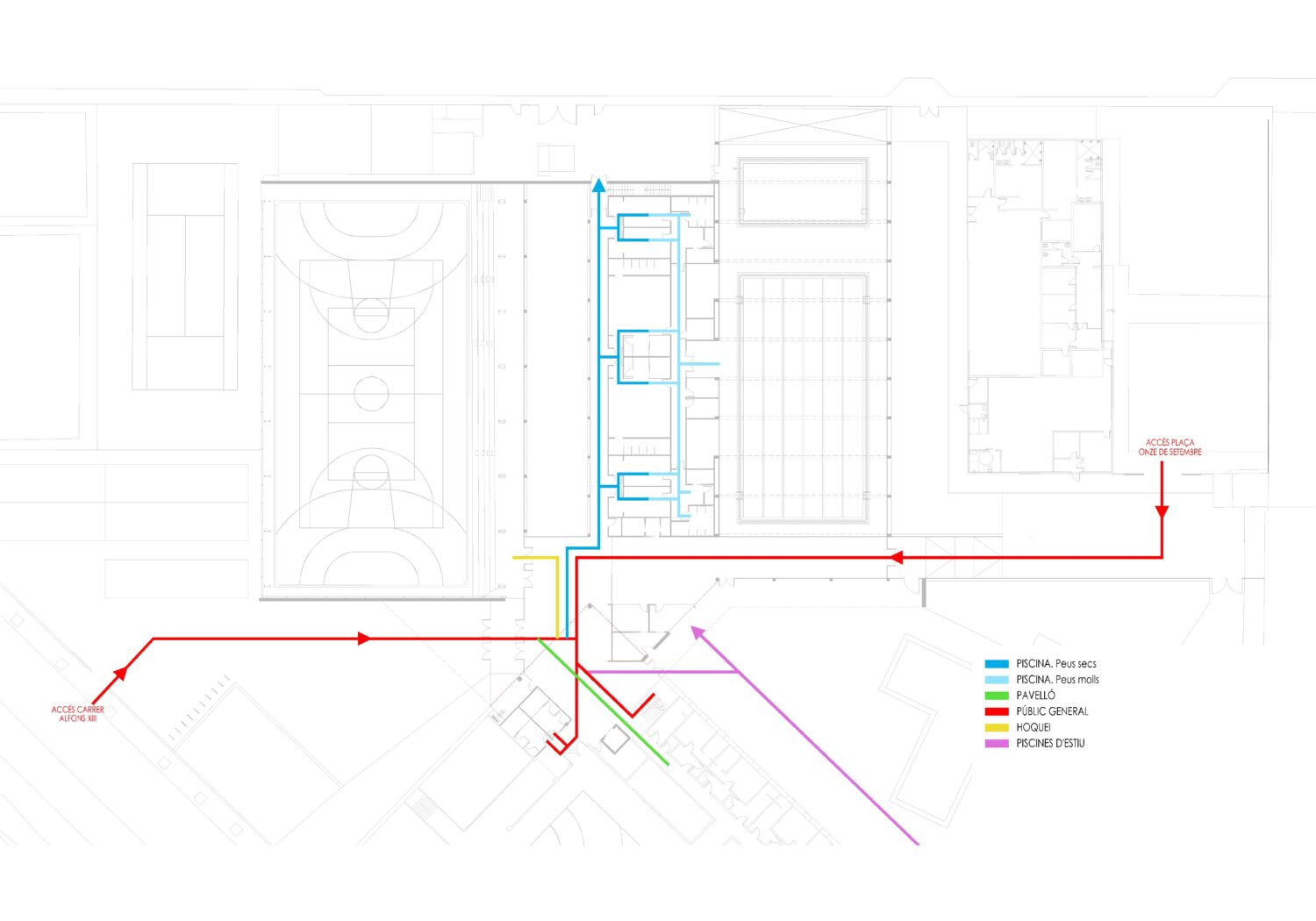 The building is composed of two rectangular volumes arranged in parallel: one containing the changing rooms and the other the indoor swimming pools. These are supported by a perpendicular bar that houses the building’s entrances and serves as a hinge between the new facility and the existing sports hall and hockey rink. On the first floor, the fitness room of the sports hall is expanded by means of a volume that opens towards the access area, offering views of the river while also shaping the porch of the main entrance to the building.