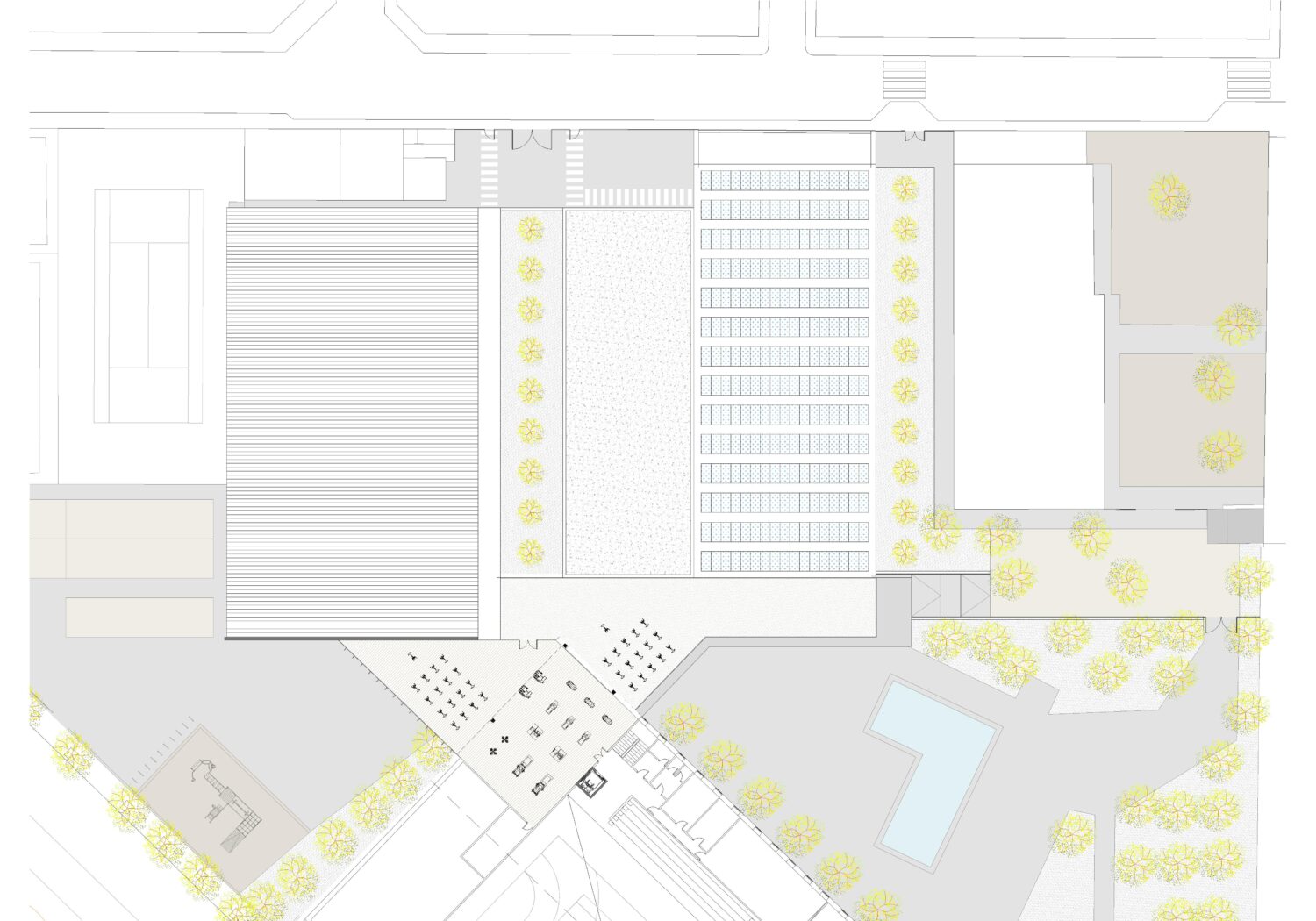 Two longitudinal courtyards are proposed, one on each side of the building, allowing natural lighting and ventilation of the spaces while also creating a sequence of solid and void with the two adjacent buildings. These courtyards will feature vegetation that will act as a solar protection barrier.