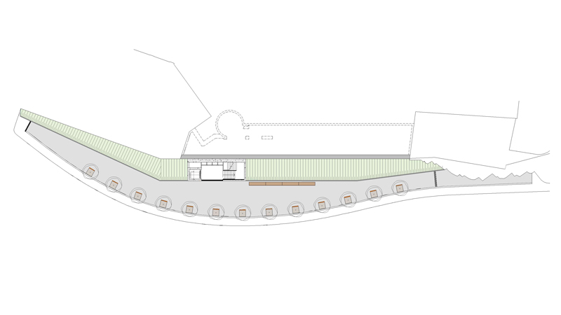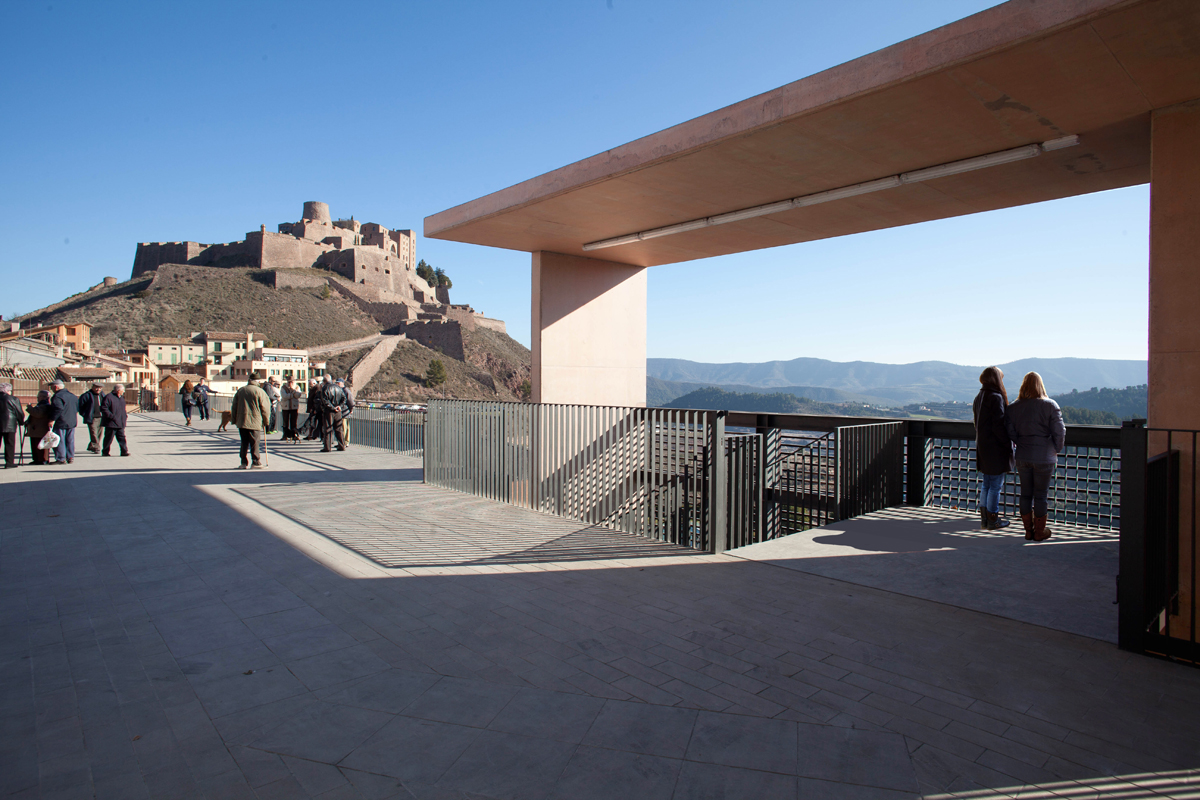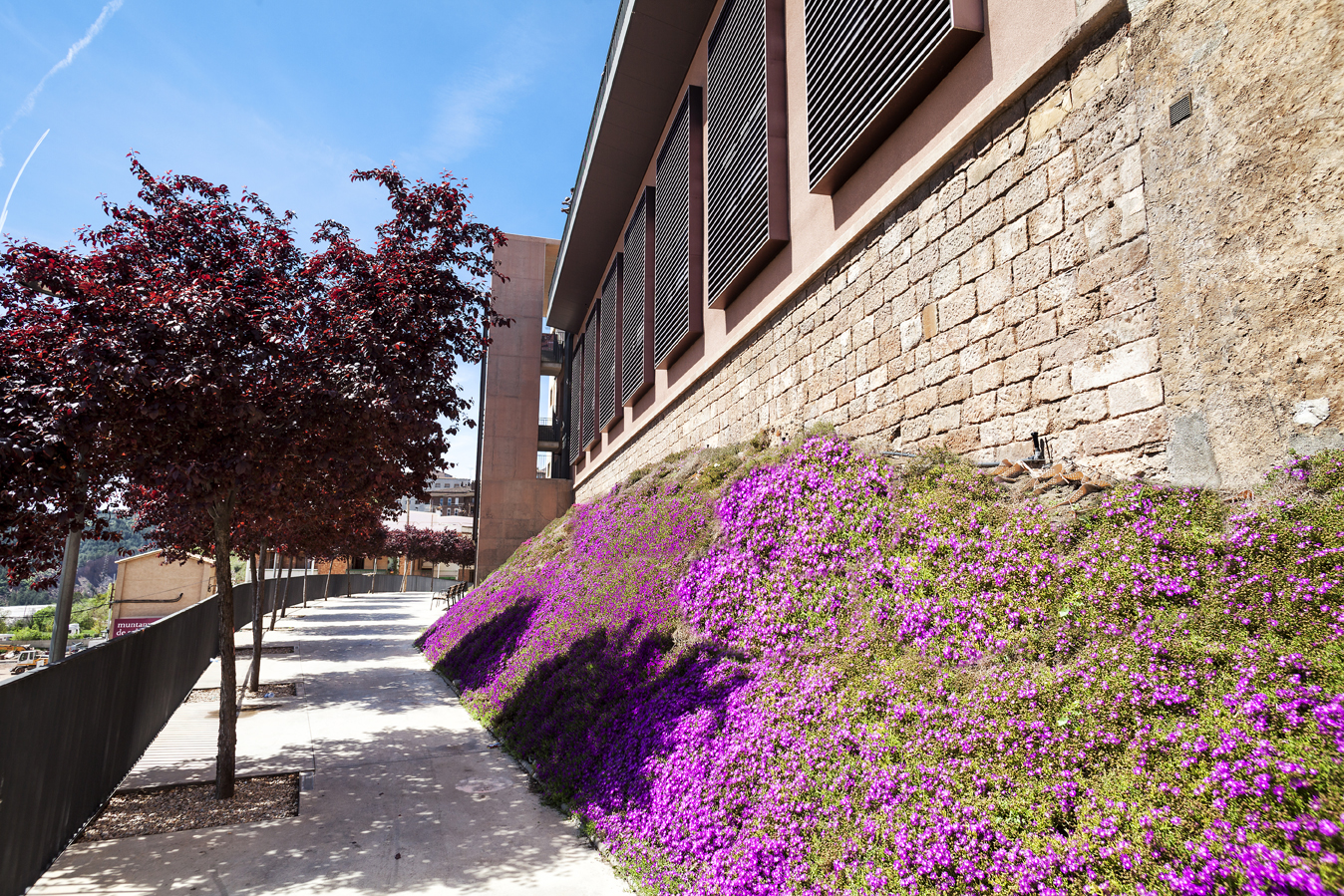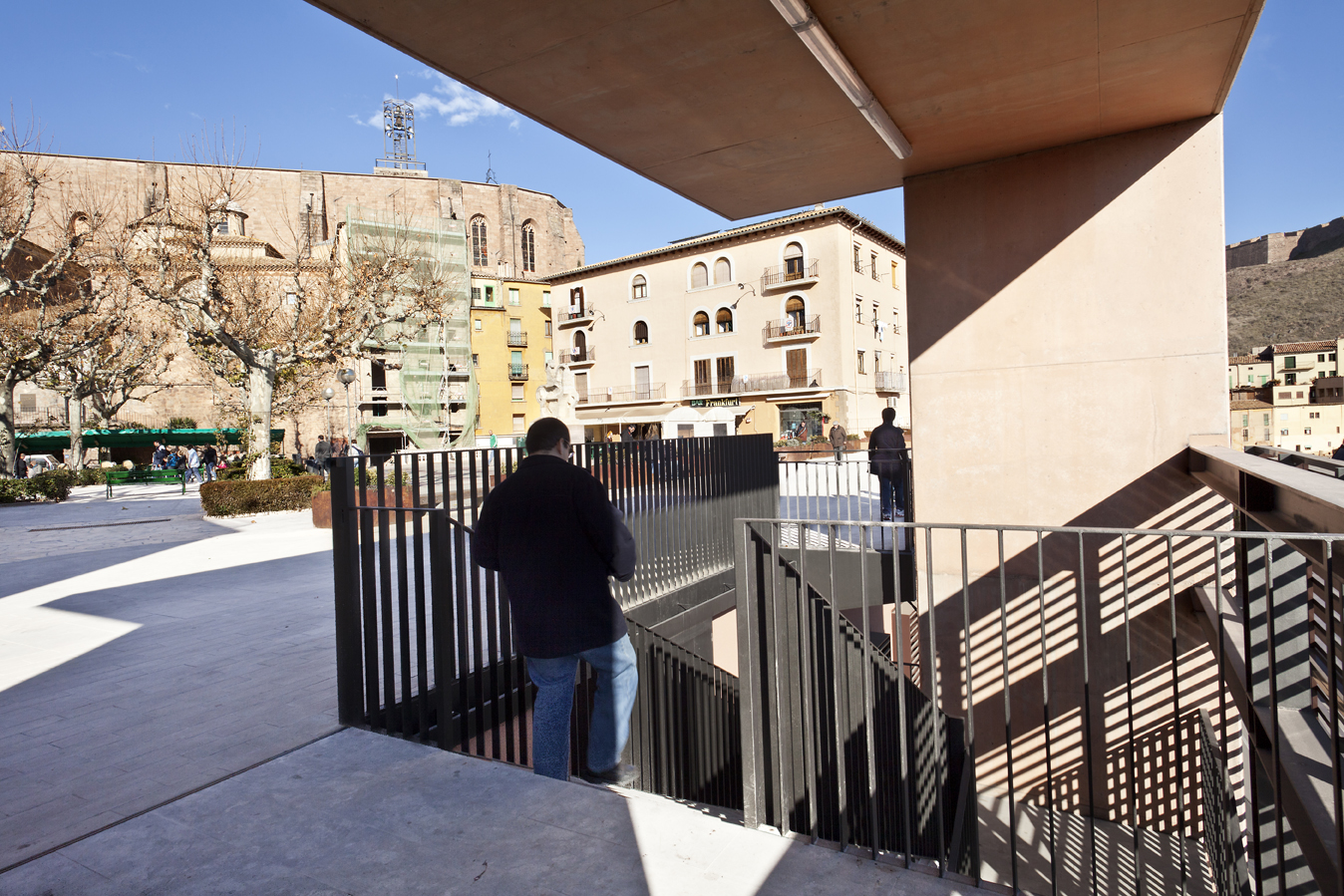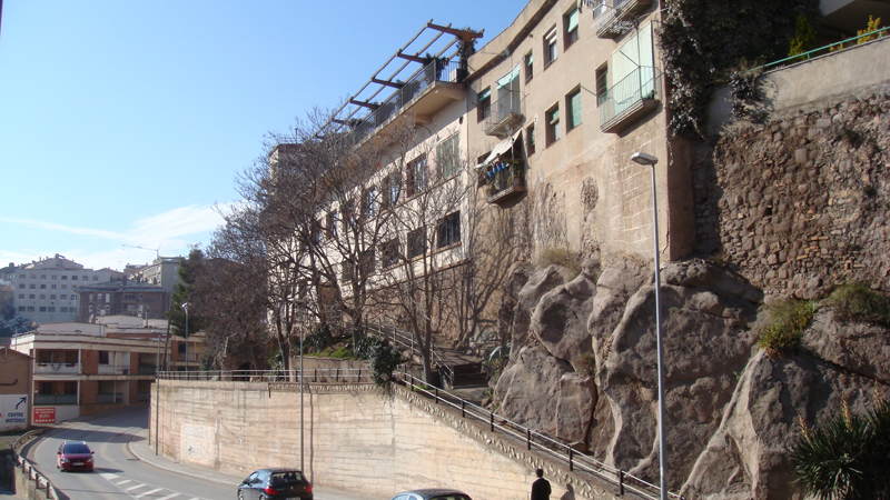 The rehabilitated building is a rectangular semi-encased volume below the square of plaça de la Fira. It consists of two floors and has a single façade facing south, which opens to the road of the Miracle. It was built in the 60s, after the collapse of the retaining wall of the square.