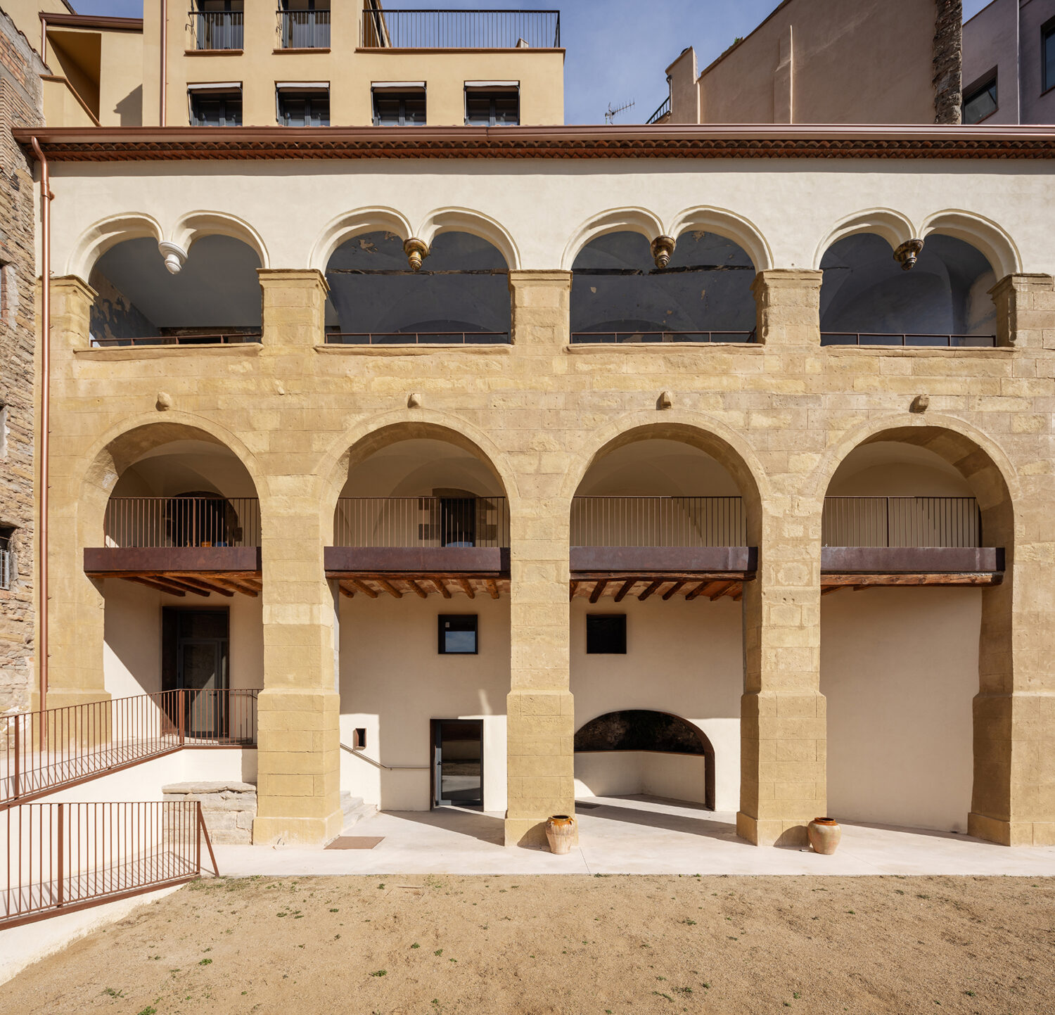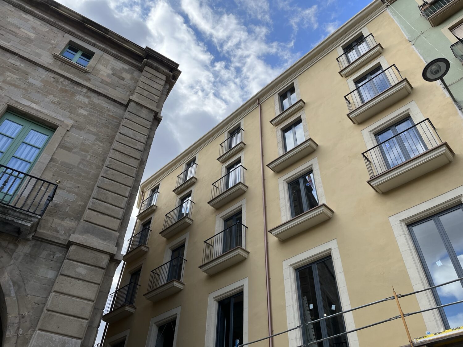 It is a listed housing building consisting of a basement, ground floor and four upper floors. It originates from the 17th century and was formed by the aggregation of four different structural units that were unified around 1853. It is a typical example of neoclassical architecture as seen in the composition of the main façade, with balconies decreasing in height, made with stone slabs and wrought iron railings. The rear façade, from the 18th century, has two series of arches. The lower semicircular and very high ones help to overcome the uneven ground and provide light to the ground floor and basement, while the upper ones form a beautiful gallery of lowered arches, with hanging capitals.