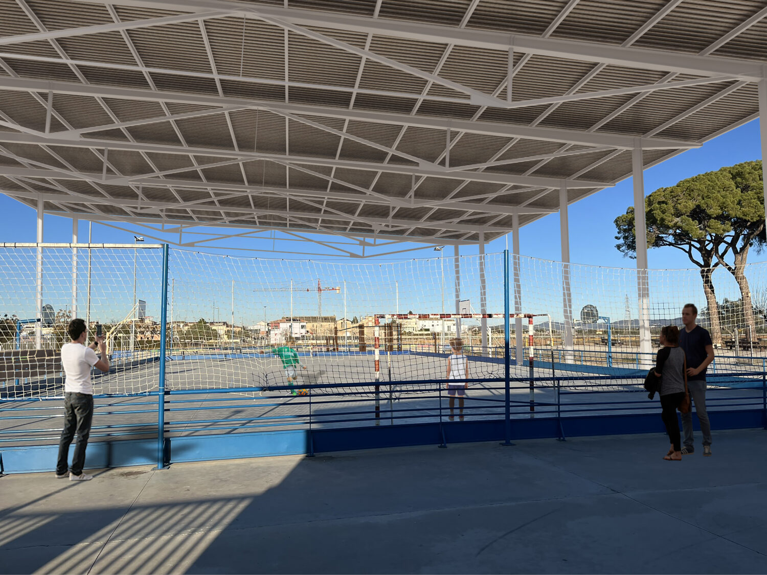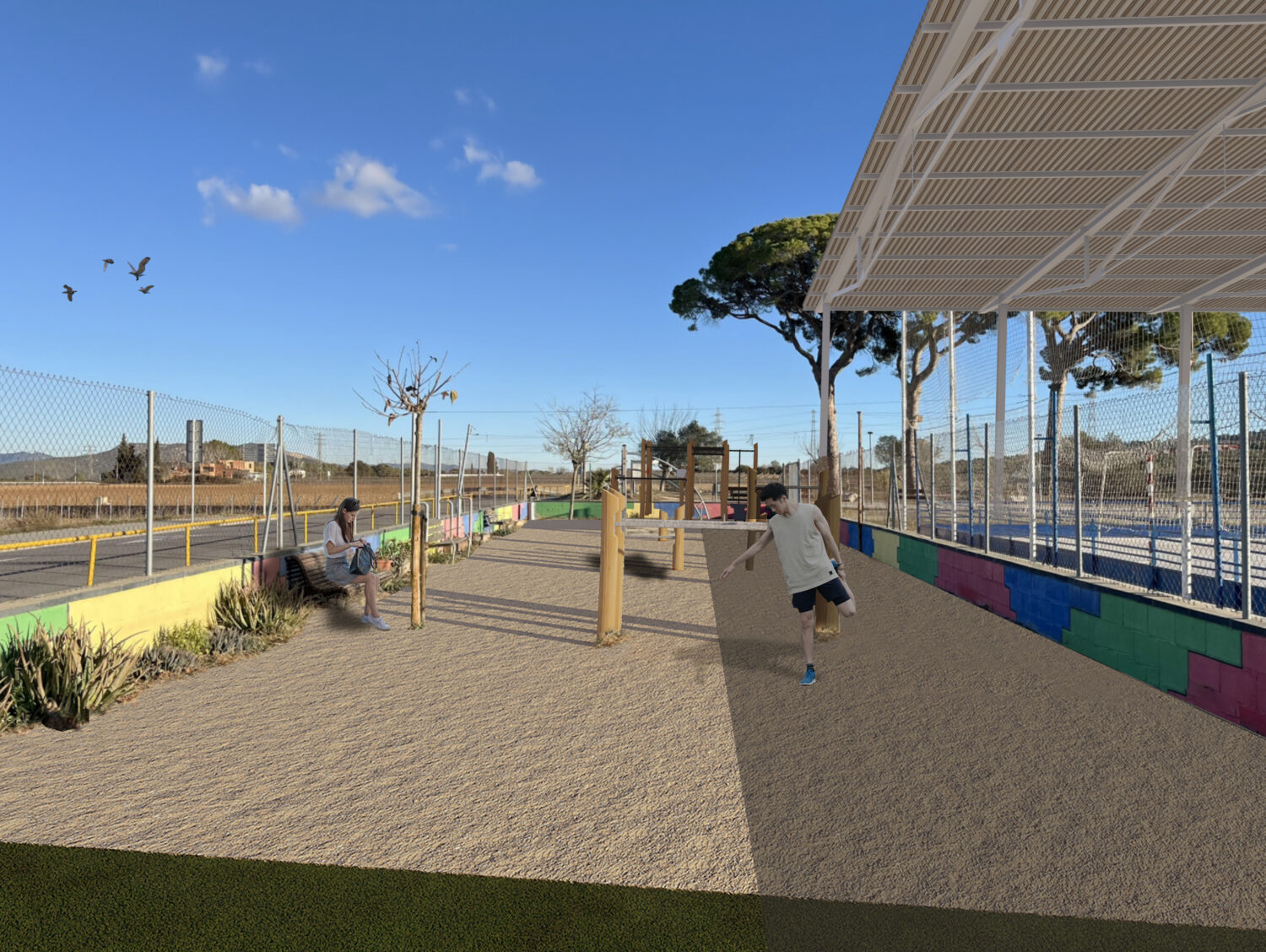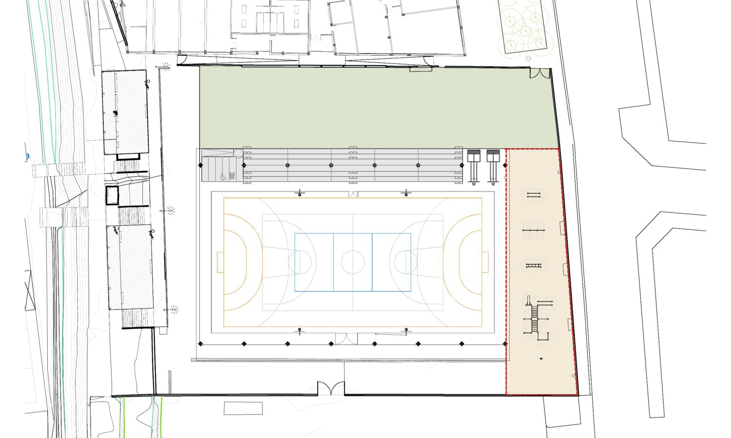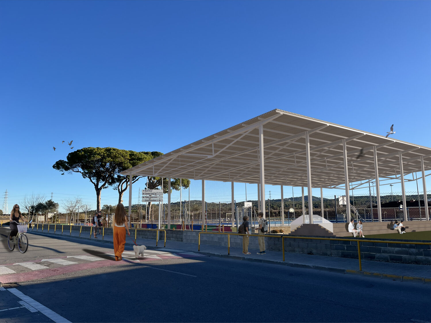 Una nova grada de formigó formada per 3 bancades amb doble mirador , una sobre la pista coberta i l’altre sobre un camp d’entrenament on es col.locarà gespa reciclada un cop es tregui la del camp de futbol . A la zona de grades hi ha una zona destinada per persones amb mobilitat reduïda.