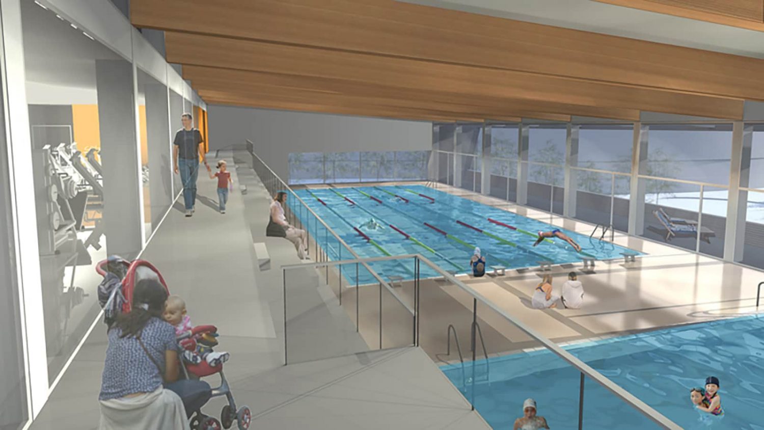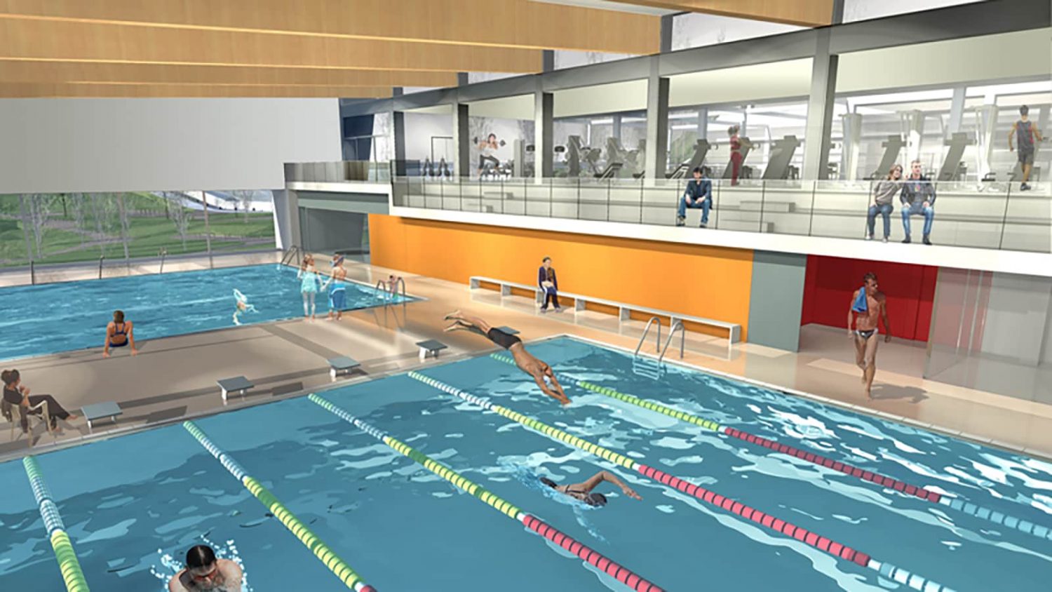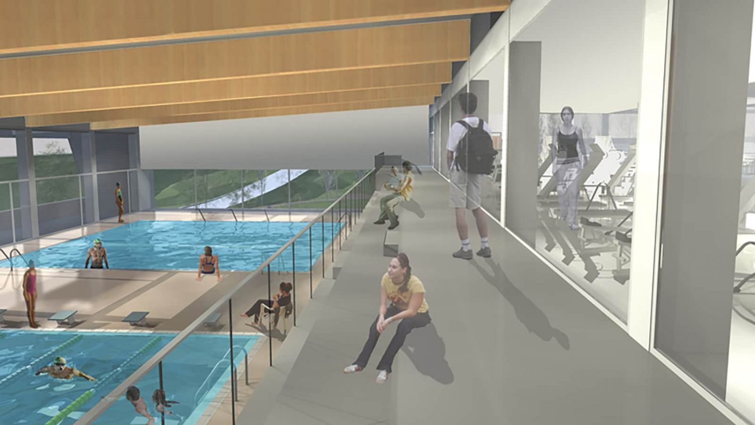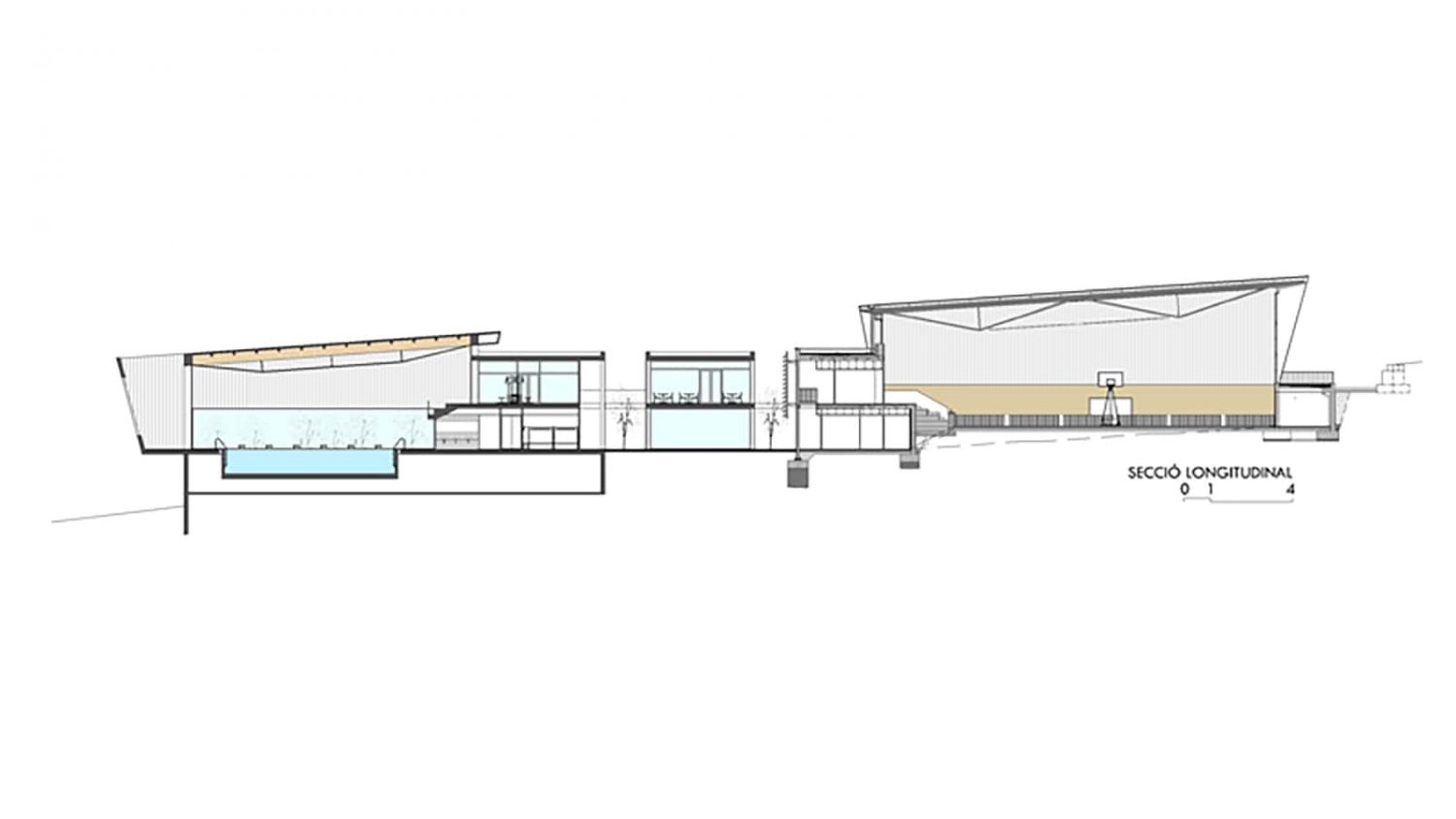 El nou complex esportiu es planteja com una seqüència de tres volums clarament diferenciats. Als dos extrems es situen el pavelló poliesportiu i la piscina coberta, i el volum central és on es troben els accessos, circulacions i patis de llum.