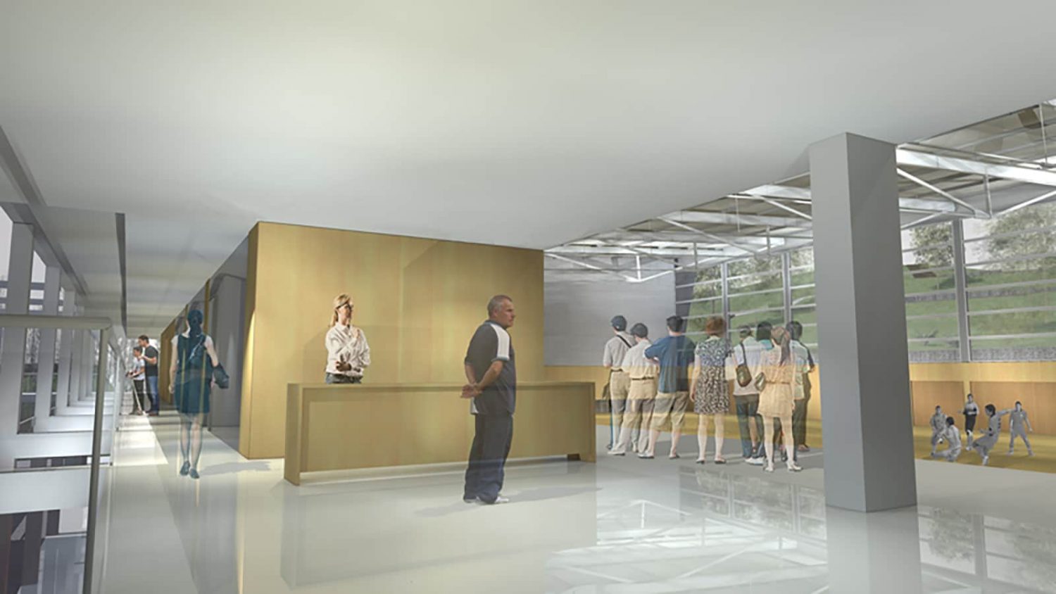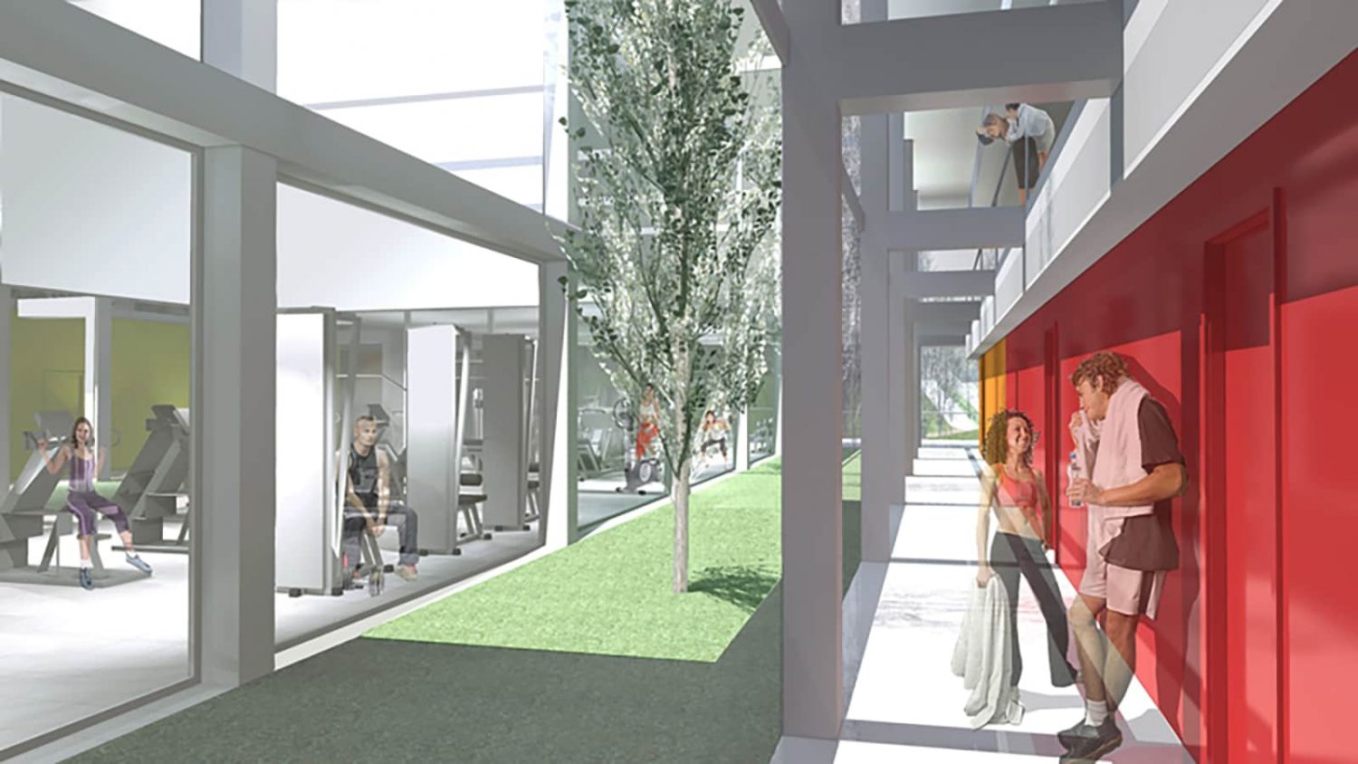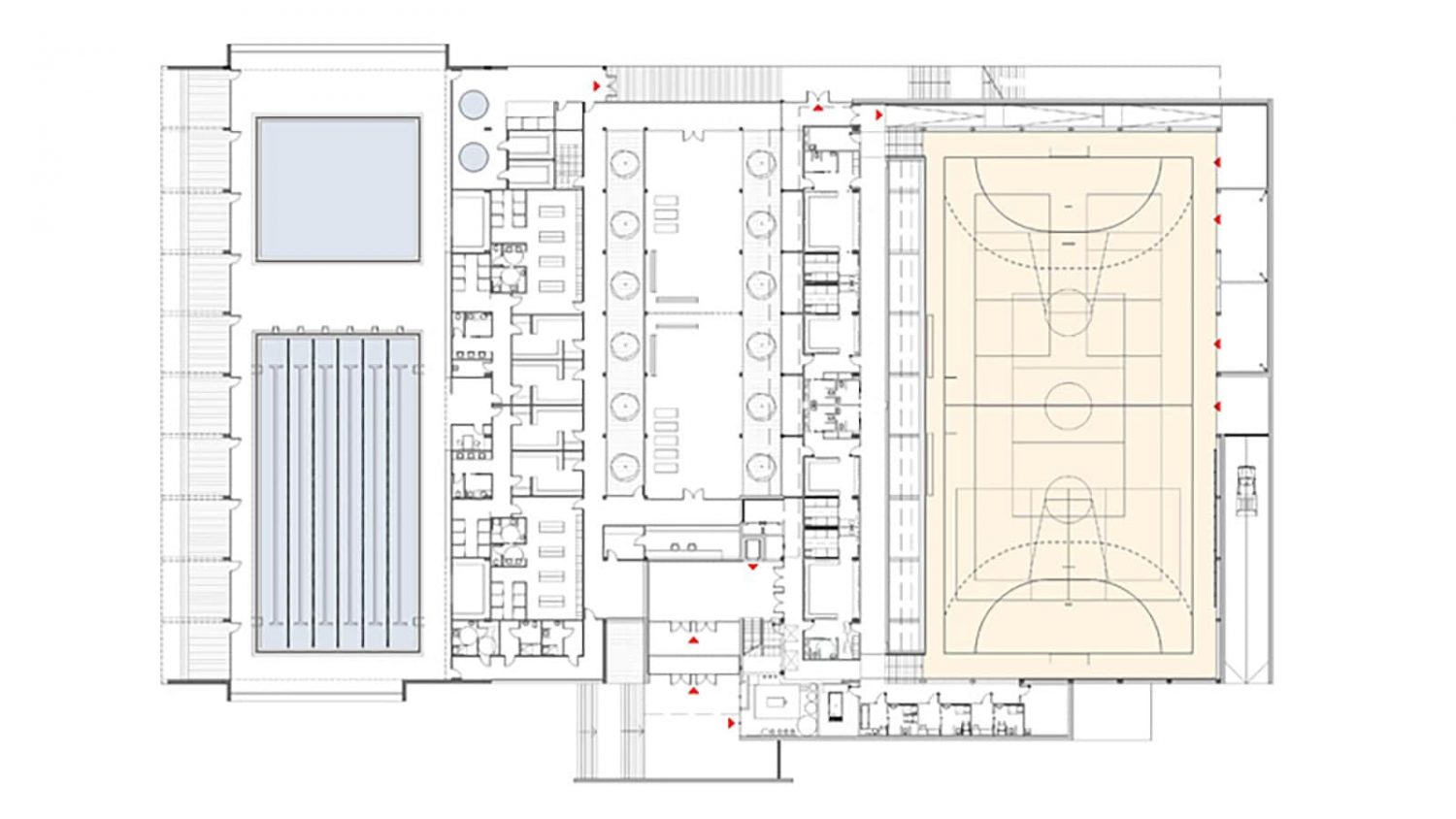 Tant a la zona de poliesportiu com a la piscina, la peça de vestidors actua com a element de transició entre el recorregut de peus bruts i la zona de peus nets, o descalços en el cas de la piscina.