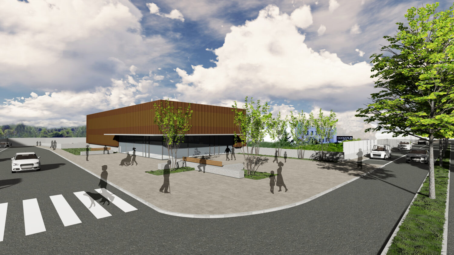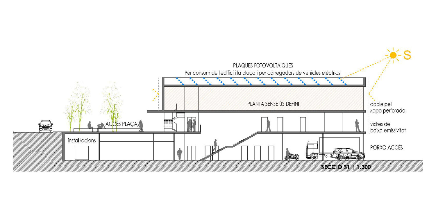 Seguint la proposta de l’estudi de programació es crea un gran espai públic davant l’edifici amb una zona de bancs i arbres que fan més amable l’accés i alhora donen més notorietat a l’equipament.