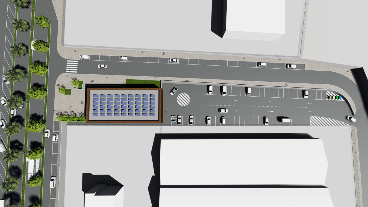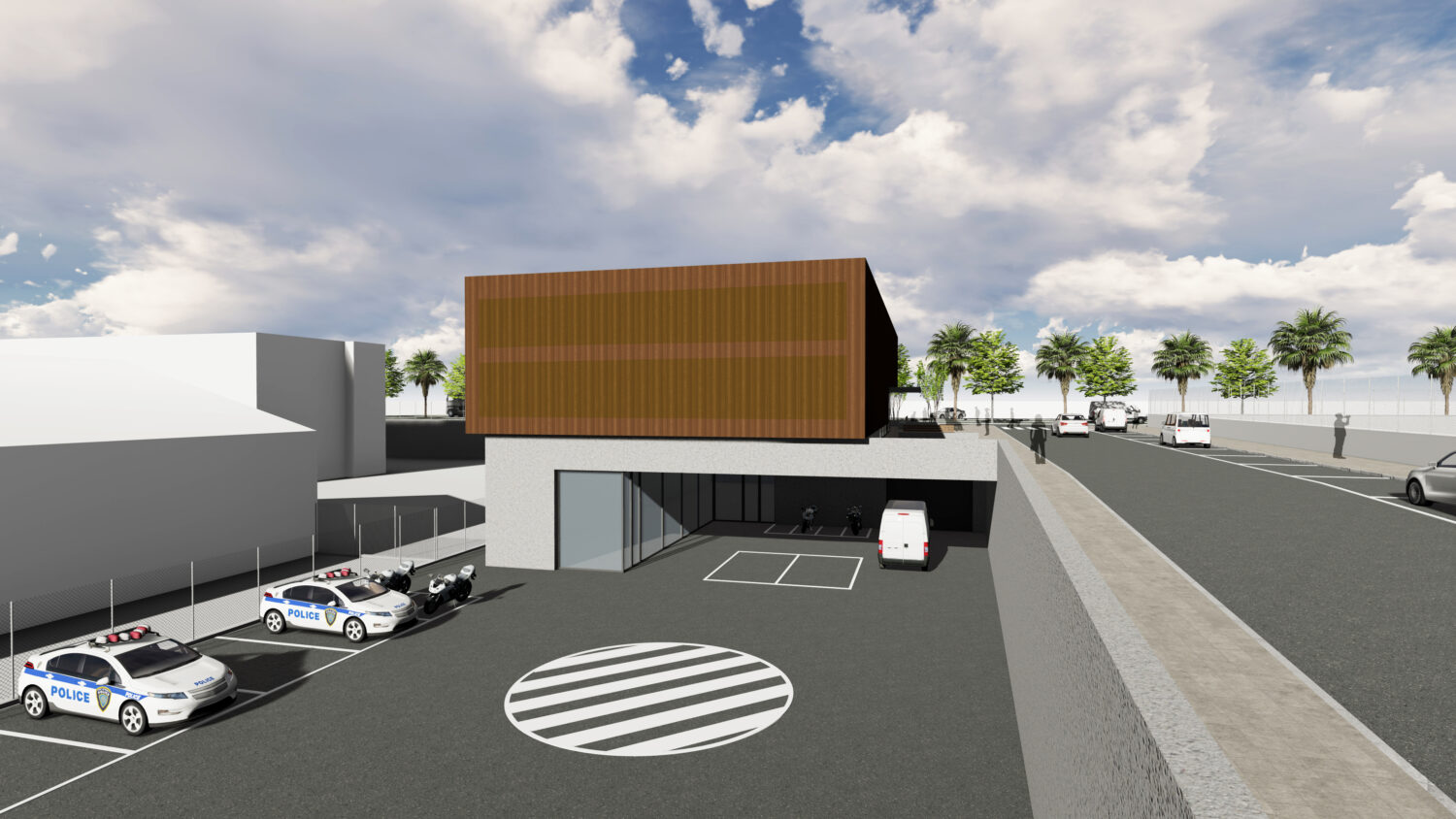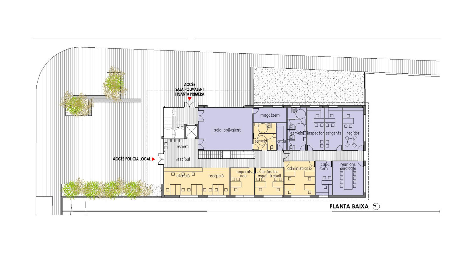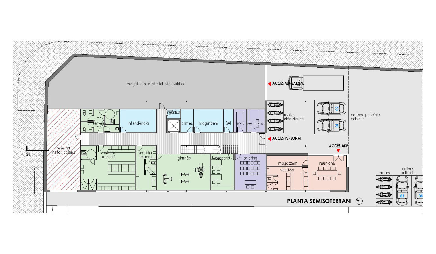 A la planta inferior es genera un gran porxo on es situen els accesos del personal de policia, dels ADF i del magatzem de material vial. Sota el porxo també s’hi situen les motos elèctriques i dos cotxes policials.