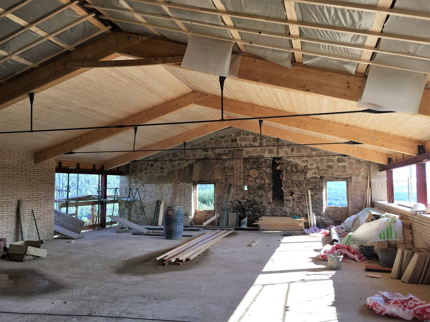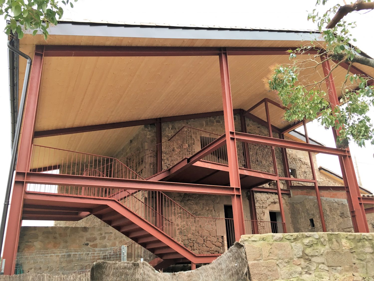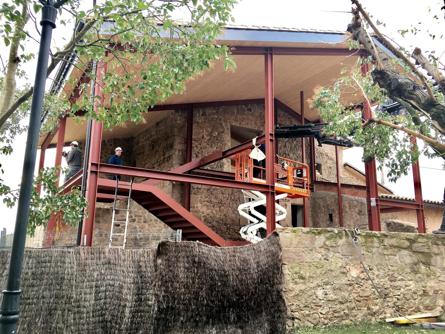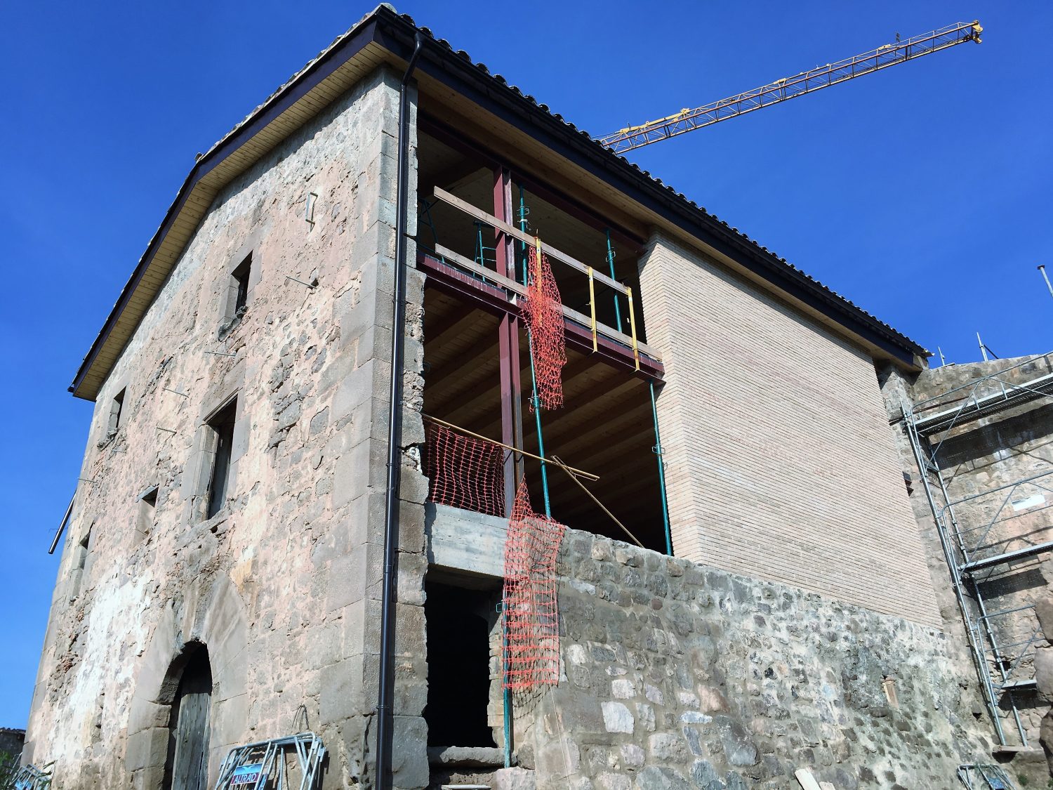 En una 1ª Fase, s’ha reconstruït l’estructura i ampliat un volum on s’encabiran els accessos. S’ha consolidat estructuralment l’edifici amb la substitució dels forjats i la coberta existents per uns de nous de fusta.